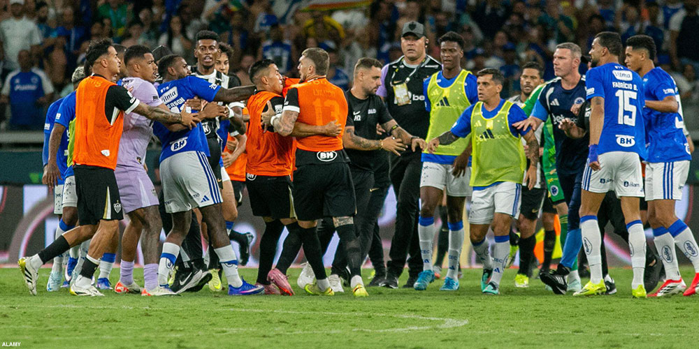 Stökigare matcher än den som spelades inatt svensk tid i Brasilien mellan Cruzeiro och Atletico Mineiro får man leta länge efter. Cruzeiro ledde finalen i Campeonato Mineiro mot rivalen med 1-0 när allt spårade ur i slutminuterna av matchen. Då kolliderades Cruzeir-spelaren Christian med Atletico Mineiros målvakt Everson när båd gick efter bollen. När Christian låg ner såg Everson ut att trycka till honom med knäet.