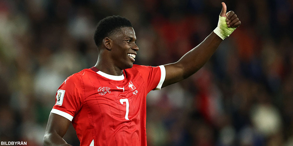 När Schweiz vinner bollen, går första passet nästan alltid mot vänster kanten. Ndoye startar direkt i djupled, Rieder följer efter, och Embolo rusar mot mål.