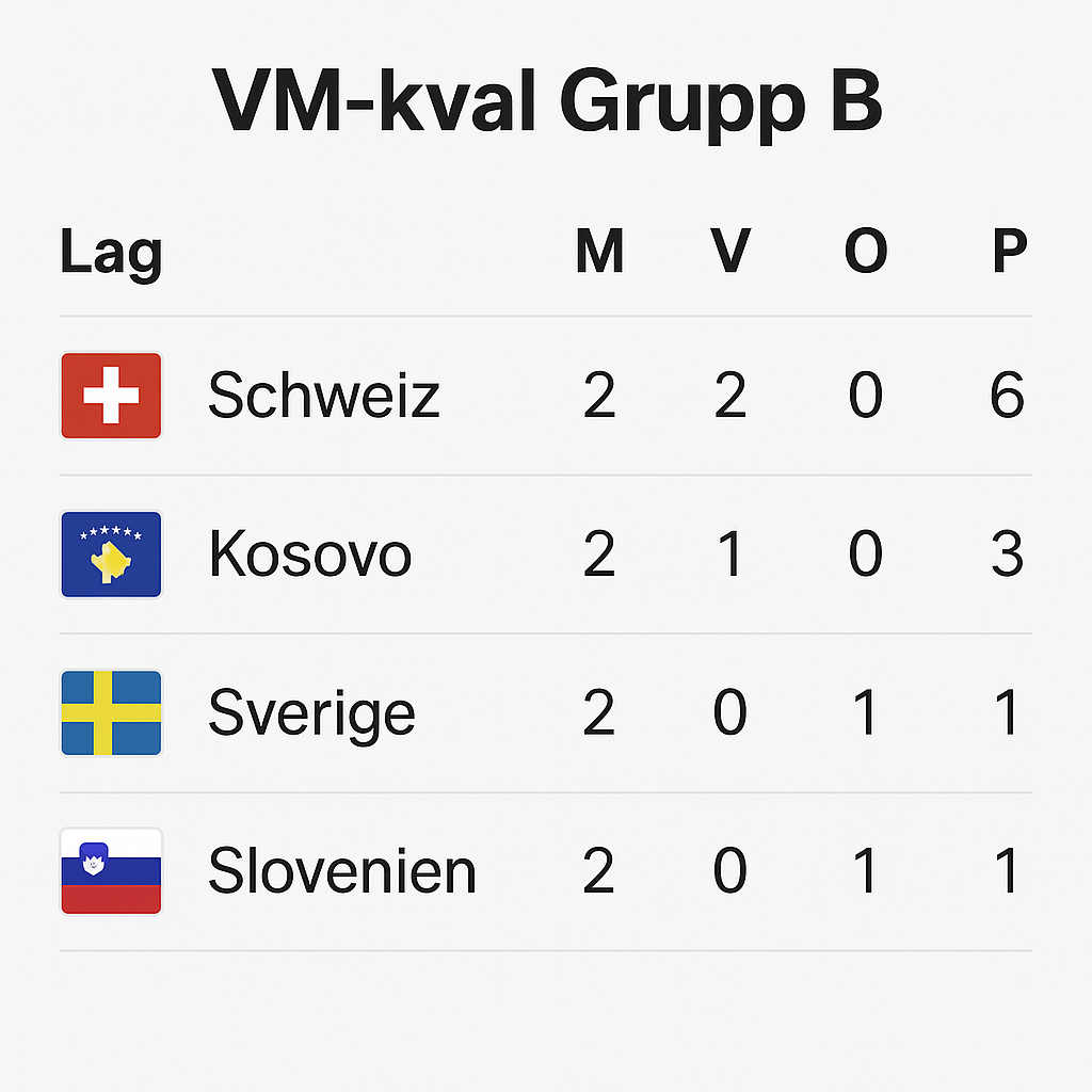 Sverige behöver alltså börja vinna direkt. Fyra matcher återstår, och vid full pott kan laget nå 13 poäng – men det kräver segrar mot både Schweiz och Kosovo.