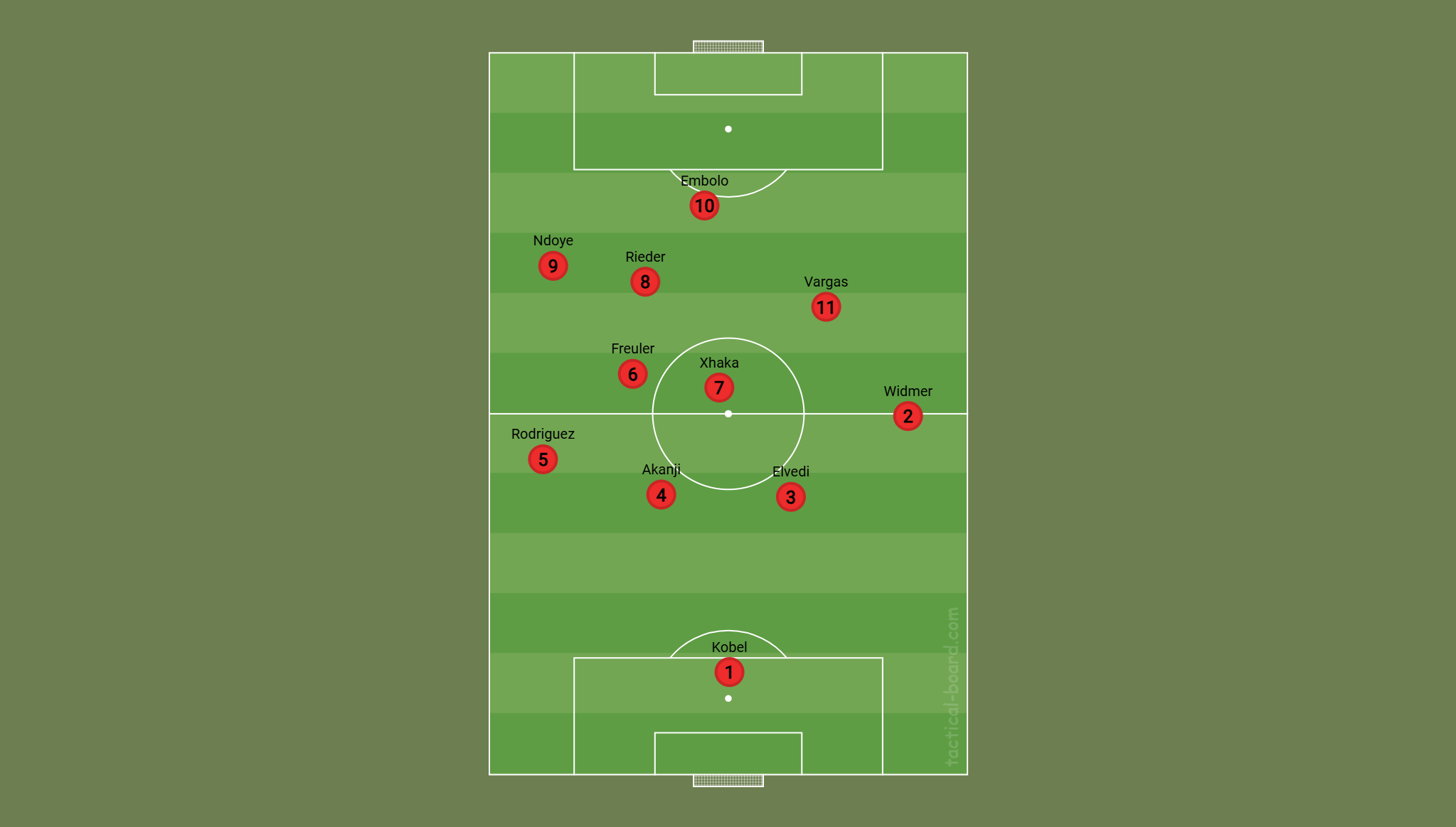 OffensivtAkanji och Elvedi attackerar alltid första ytan.Embolo jagar andrabollen. Xhaka står utanför boxen för att samla returer.