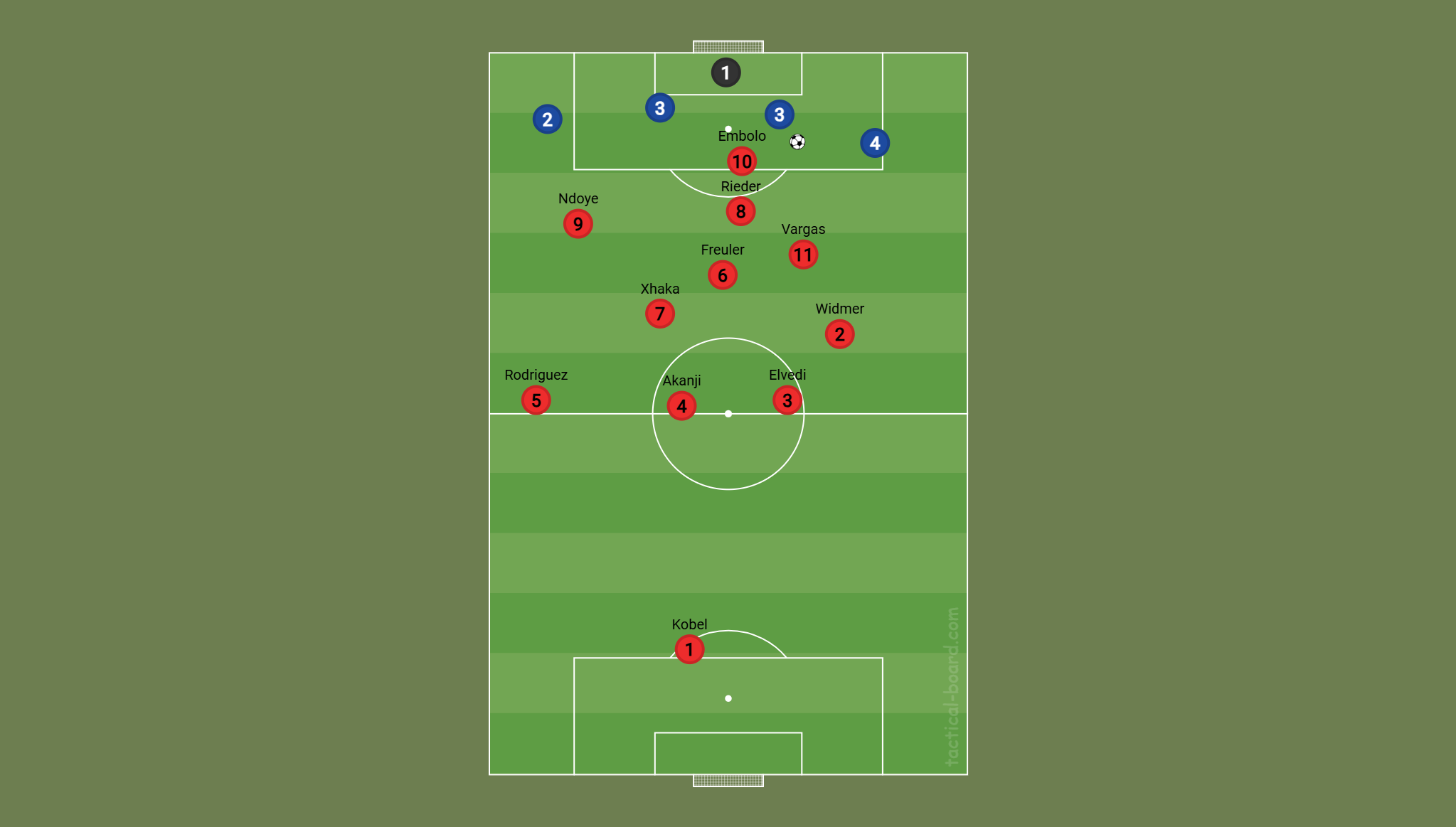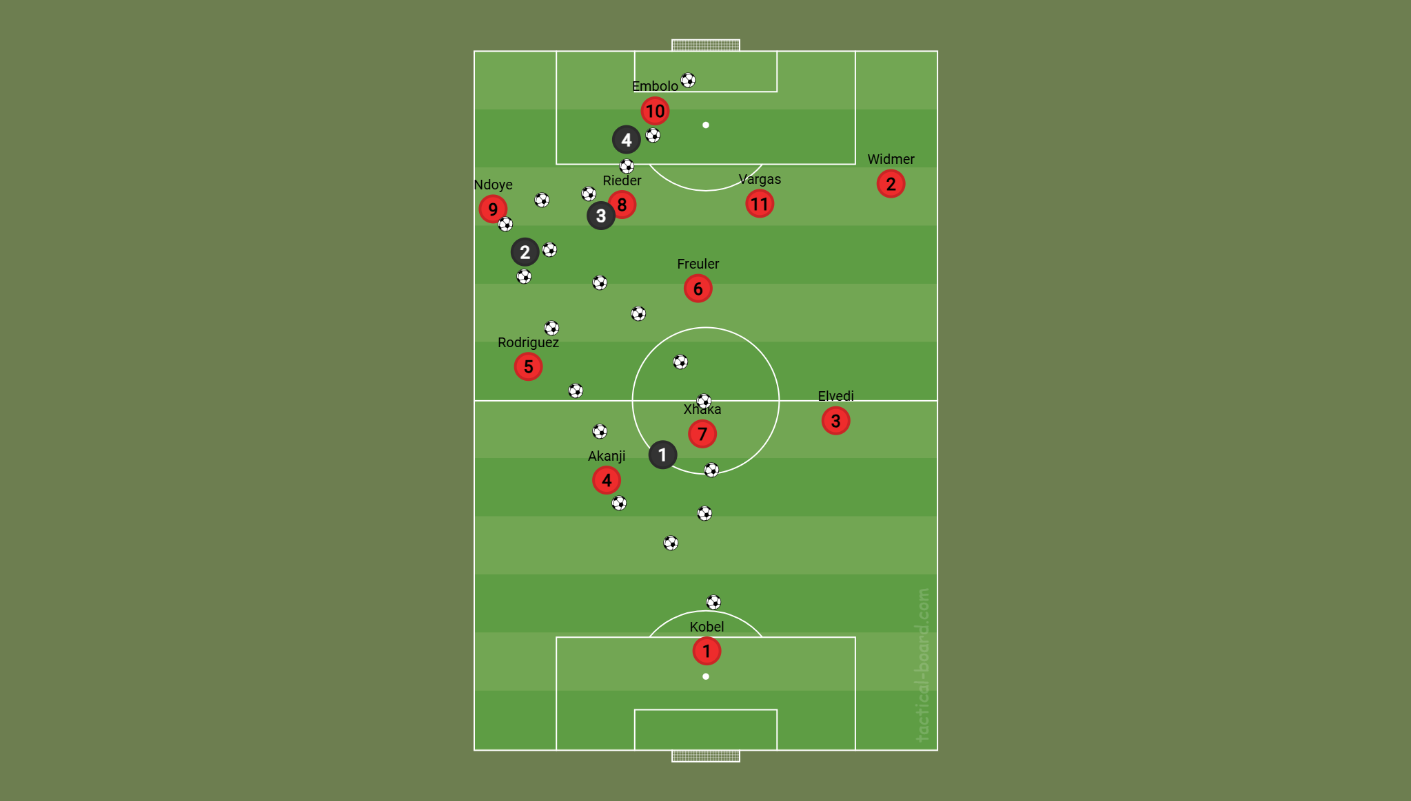 När bollen hamnar hos motståndarens backlinje kliver Vargas och Widmer ihop och stänger vägen inåt. Det är deras klassiska “pressfälla”. När Schweiz sätter hög press, styr Embolo spelet utåt. Rieder stänger den centrala passningen. Widmer trycker upp på ytterbacken och Xhaka är redo att vinna andrabollen om pressen lyckas.