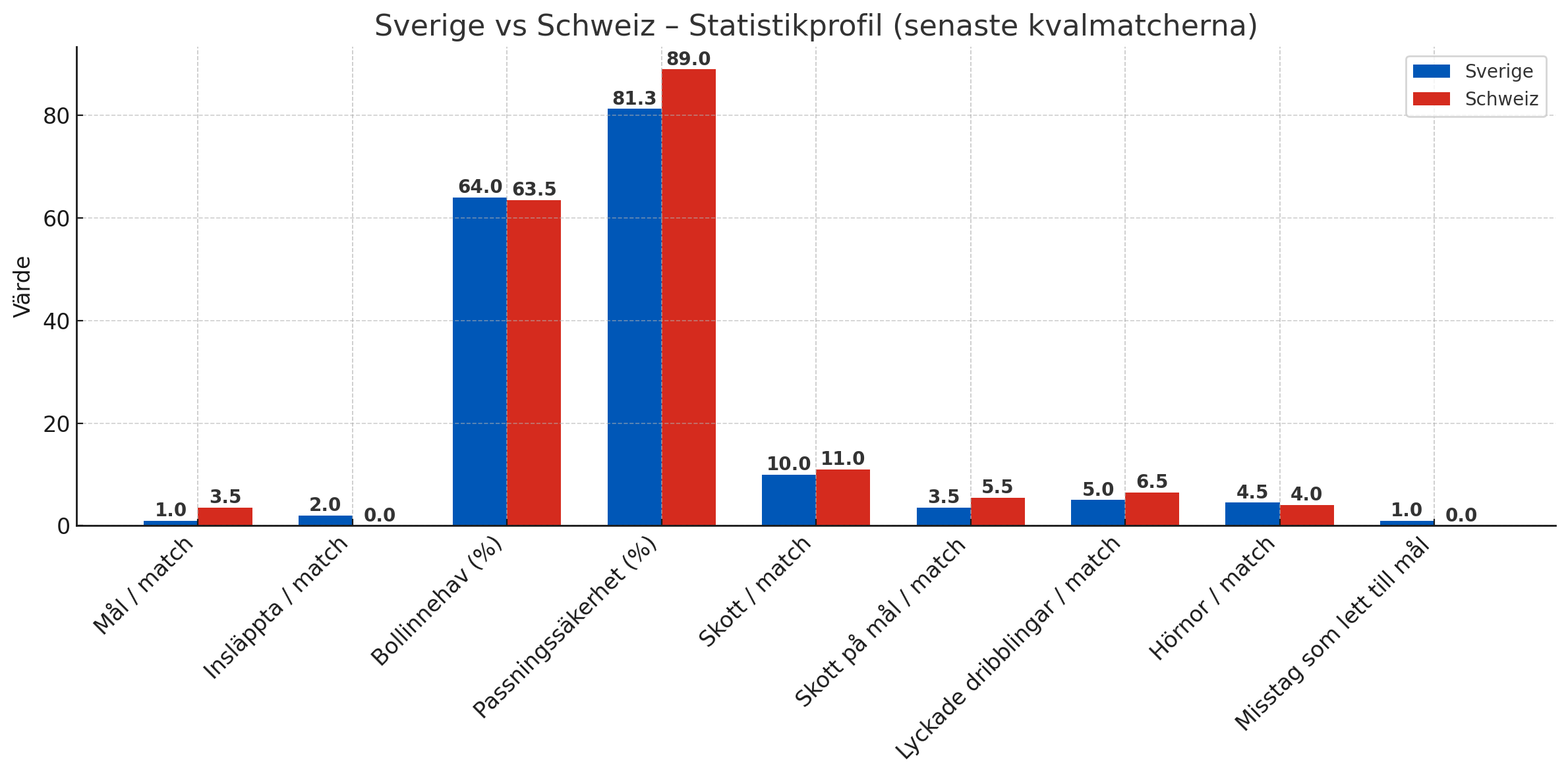 Statistiken visar exakt det ögat ser: ett kontrollerat lag som gör jobbet effektivt utan risk. Schweiz är i nuläget ett mer komplett lag – både defensivt stabilt och offensivt kliniskt. Sverige har bollen mycket men saknar precision, tempo och effektivitet. Deras spel visar på en obalans: mycket innehav, men lägre kvalitet i passningsspel, svagare avsluts effektivitet och större sårbarhet bakåt. Kort sagt: Schweiz ser ut som ett lag som vet exakt vad de vill göra med bollen – Sverige som ett lag som fortfarande letar efter hur.