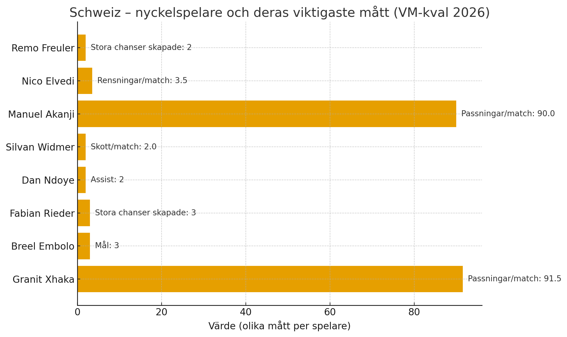 Vill du veta var Schweiz blir farliga? Titta i mitten först. Där står Granit Xhaka och håller i tempot som en dirigent. Han slår 91,5 passningar/match (89 % rätt), hittar 2,5 nyckelpass och 6,0 långbollar. Får han vända upp och titta framåt? Då kommer diagonalen som skär genom laget. Tvingas han bakåt eller åt sidan? Då tappar Schweiz fart. Enkelt att förstå, jobbigt att stoppa.