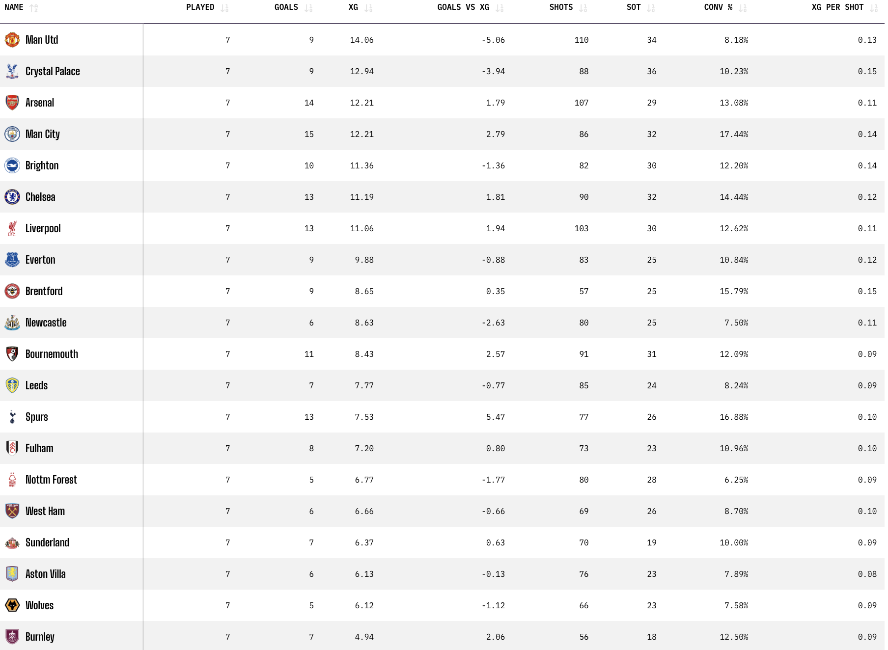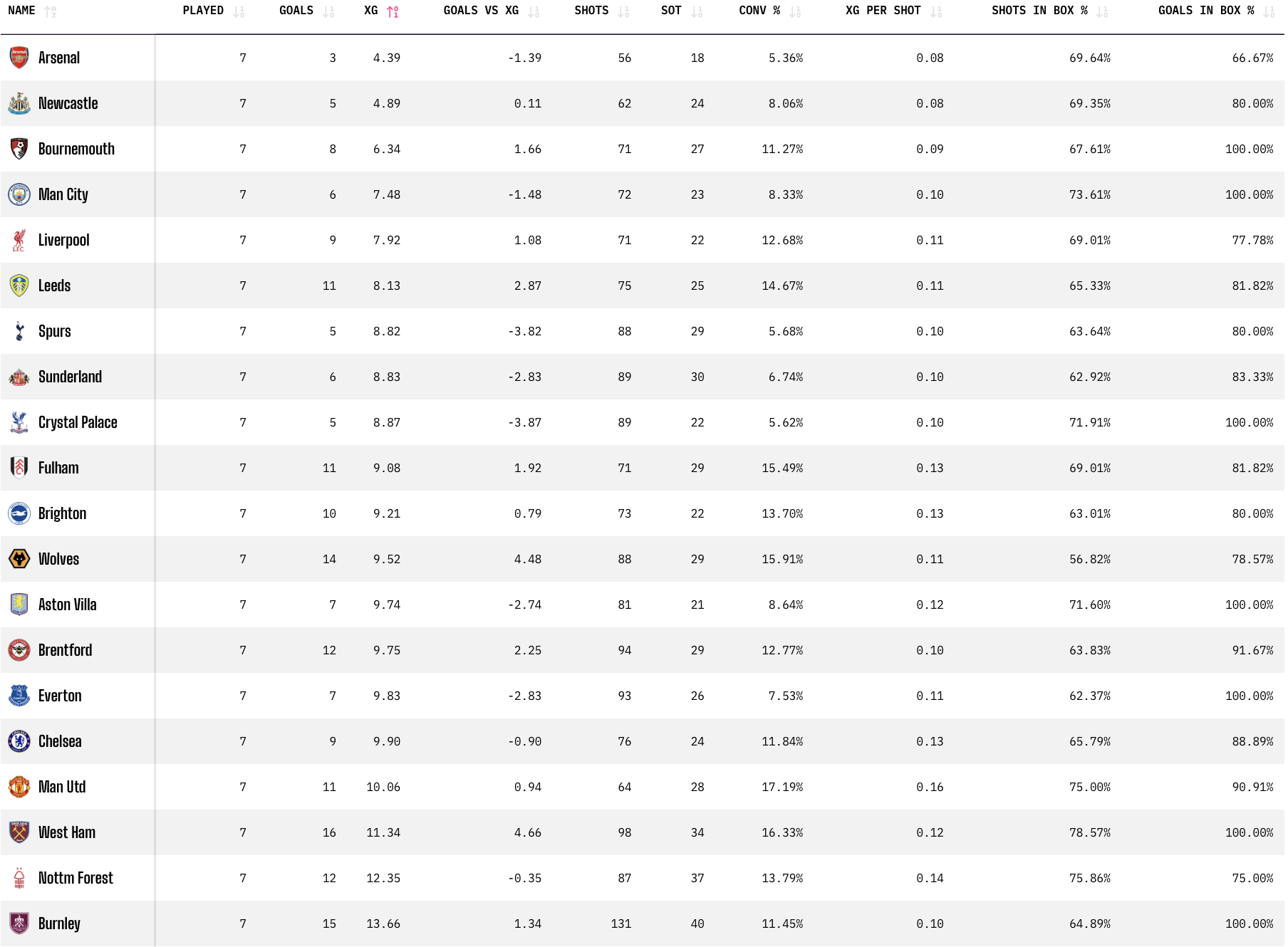 - 3a i xG (bakom Crystal Palace och Man Utd)