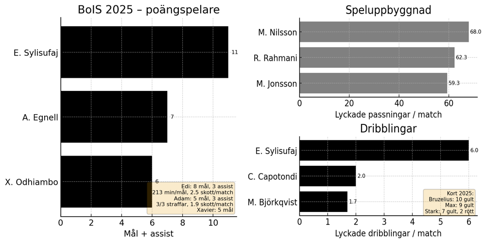 Offensivt var Edi Sylisufaj den självklara spetsen. Han hade mål i sig, tog initiativ, utmanade och bar mycket av hotet framåt. Så när korsbandsskadan kom i september rasade en stor del av anfallsspelet. Efter hans skada lyckades BoIS bara göra åtta mål på de sista åtta matcherna. Det märktes tydligt att ingen riktigt kunde fylla den rollen. Samtidigt ska Constantino Capotondi nämnas. Han blixtrade till stundtals, visade teknik och spelförståelse, men ofta saknades den där riktiga spetsen framför honom för att det skulle ge mer utdelning i poäng och mål.