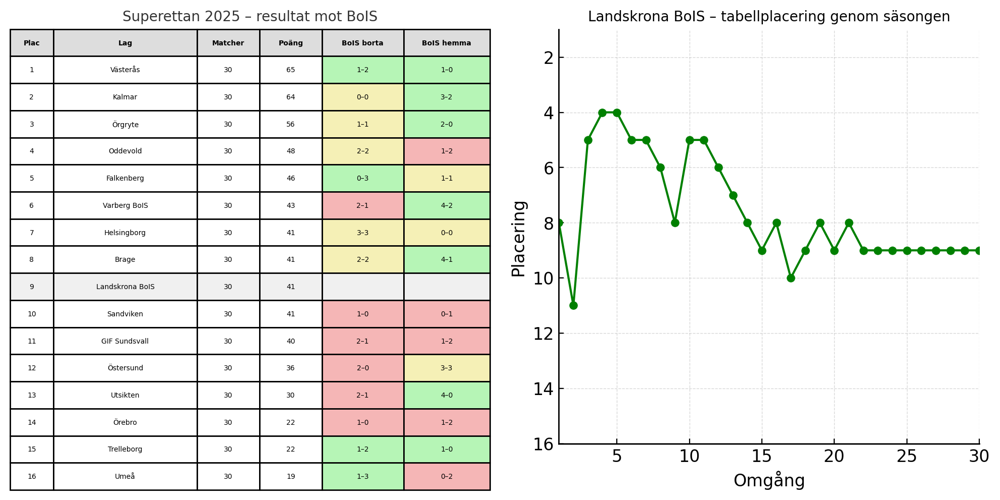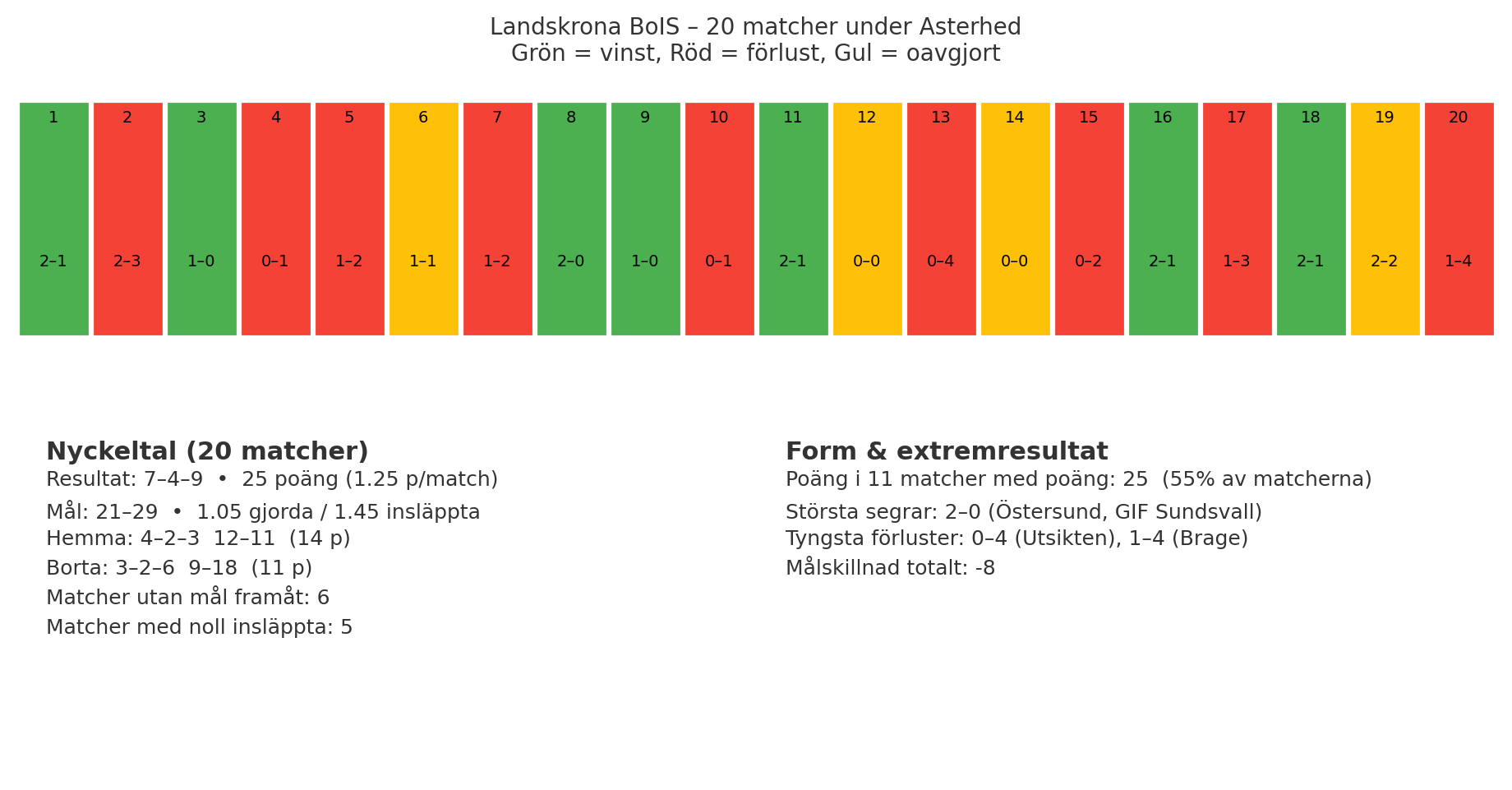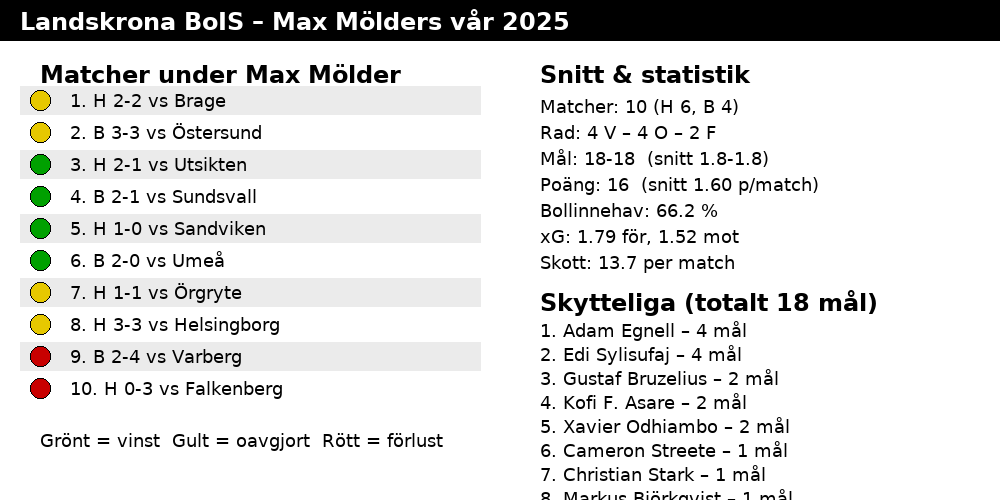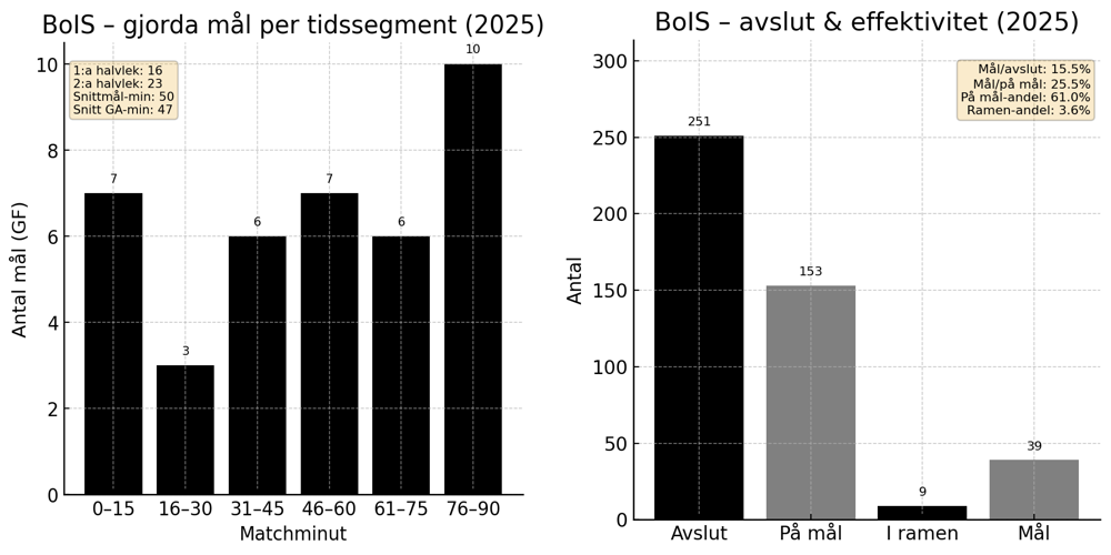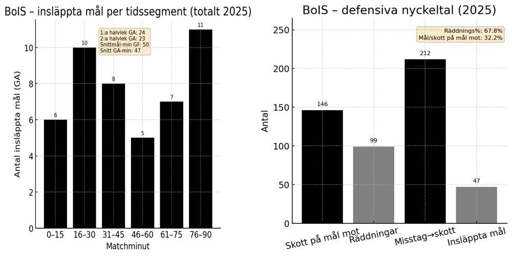 Landskrona BoIS 2025 slutar nia i Superettan på 41 poäng, med en tabellrad som knappt går att göra mer neutral: 11 segrar, 8 kryss, 11 förluster, 39–47 i mål. På pappret är det ett klassiskt mittenlag, men statistiken bakom siffrorna visar något mer intressant. BoIS var laget som ville spela med boll hade hög passnings säkerhet, mycket dribblingar – men som ofta fick betala priset i dueller, i egen box och under höstens formsvacka.