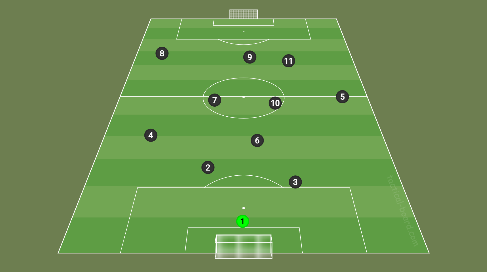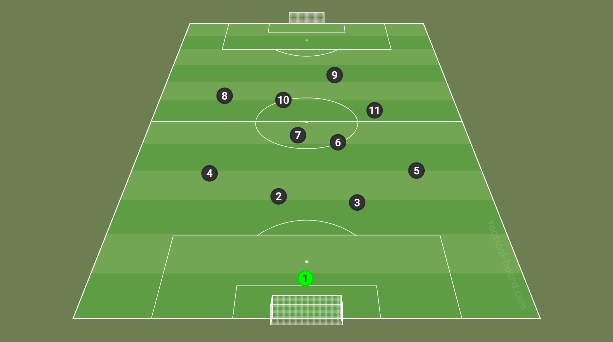 På mittfältet fanns en defensiv mittfältare som låg närmast backlinjen och skyddade ytan framför den, samtidigt som två mer löpstarka mittfältare tog sig längre fram i banan, både centralt och ut i halvyta. Längst fram bestod frontlinjen av två yttrar som höll bredd , utmanade sin back och sökte inläggsytor, men hade i uppgift att kliva in i banan när man såg ytterbackens överlapp. Man hade samt en central forward som både skulle hota i djupled och vara spelbar felvänd för att länka spelet.