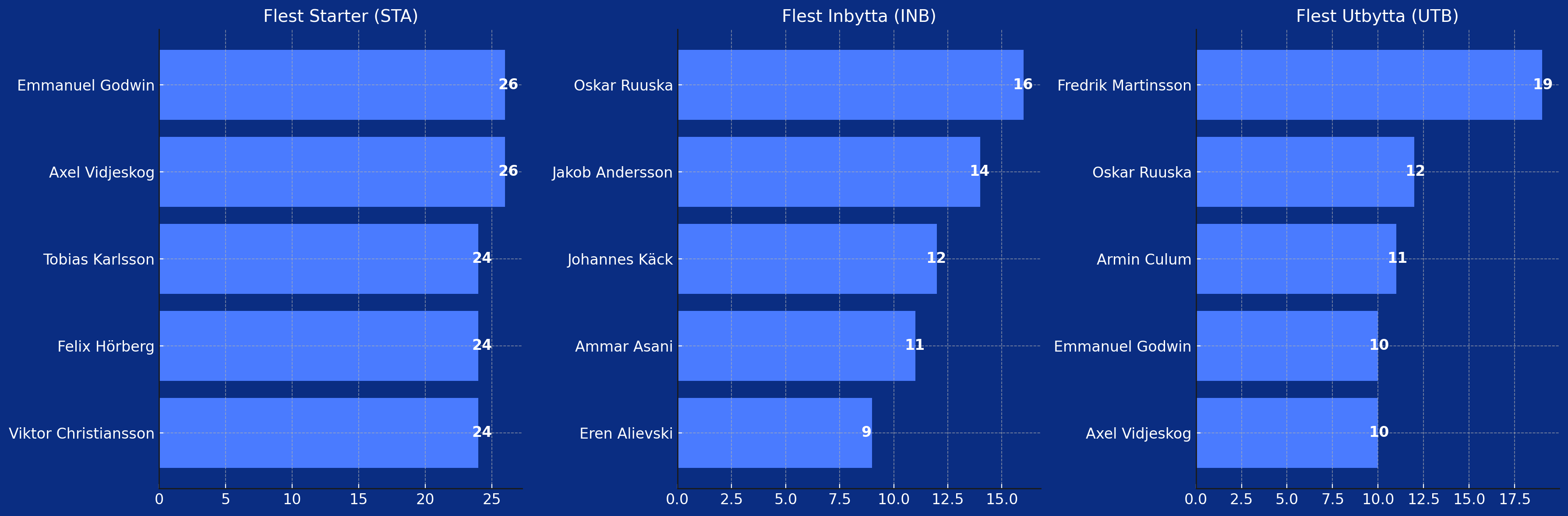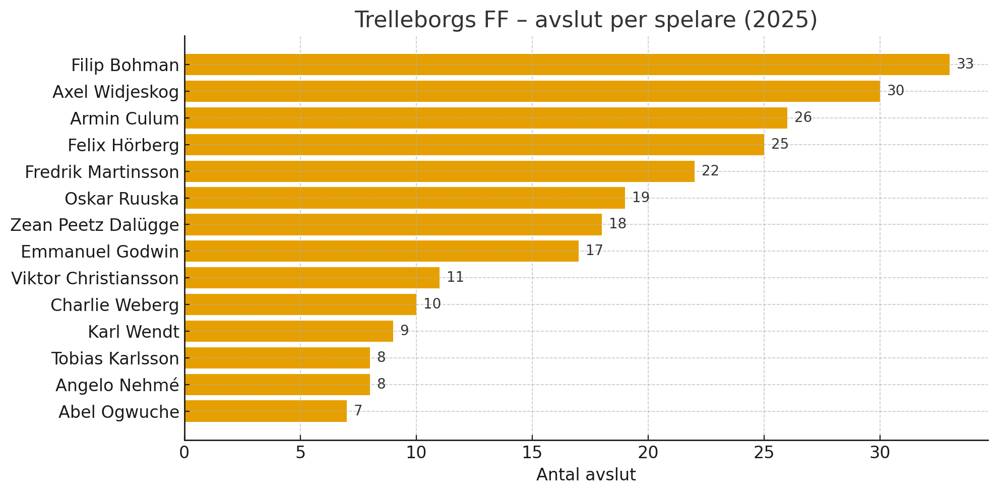 Det syns också i helheten. Trelleborg tar i snitt 13,2 avslut per match, lyckas med 18,2 dribblingar och skapar 5,3 hörnor, men ändå blir det alltså mindre än ett mål i snitt. Hälften av matcherna – 15 av 30 – slutar med att TFF inte gör mål alls. Varenda målfarlig spelare har siffror som snarare ser ut som biroller än huvudpersoner.