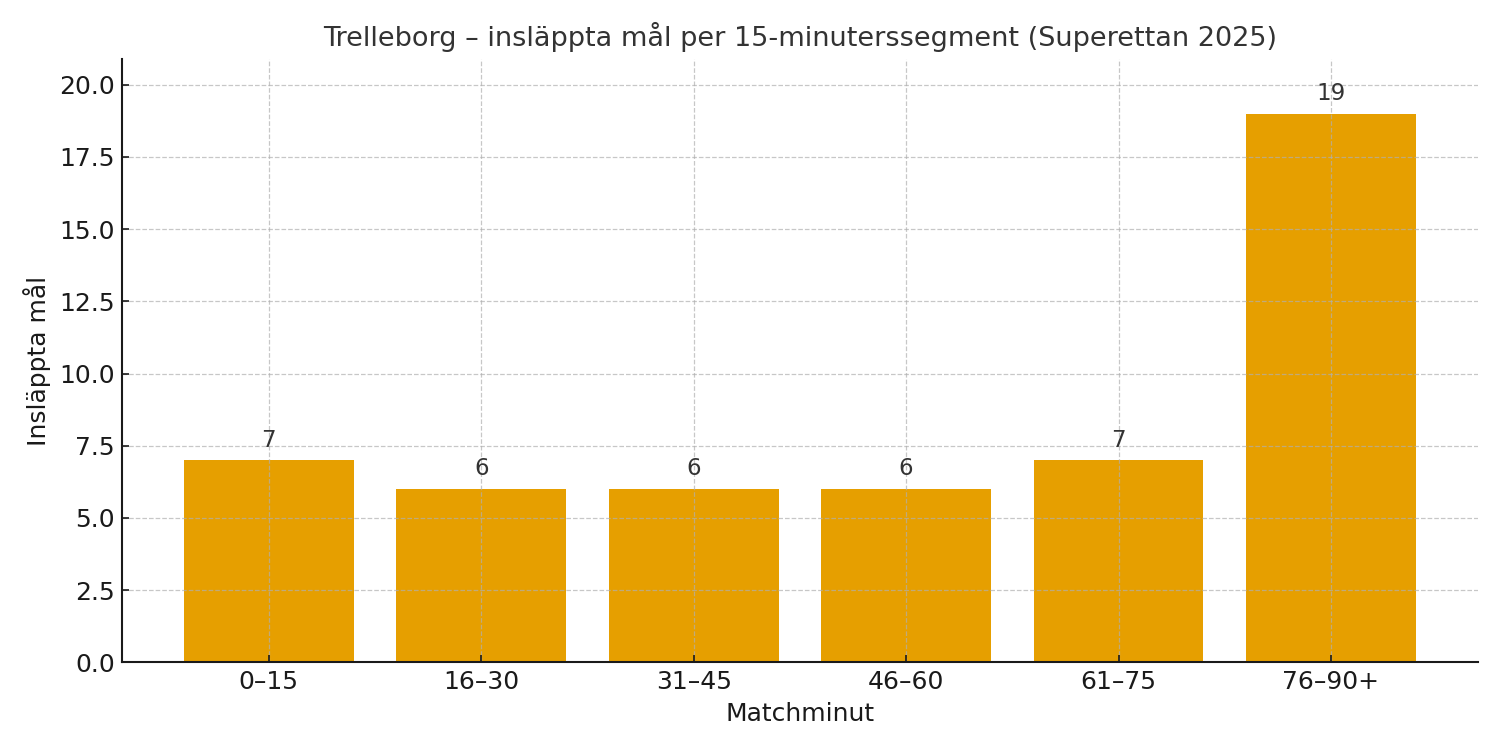 När man tittar på när målen släpps in blir bilden ännu tydligare. Trelleborg släpper in 7 mål första kvarten, 6 mellan minut 16–30, 6 strax före paus, 6 mellan 46–60, 7 mellan 61–75 – och 19 mål från minut 76 och framåt. 37 procent av alla baklängesmål kommer i slutkvarten.
