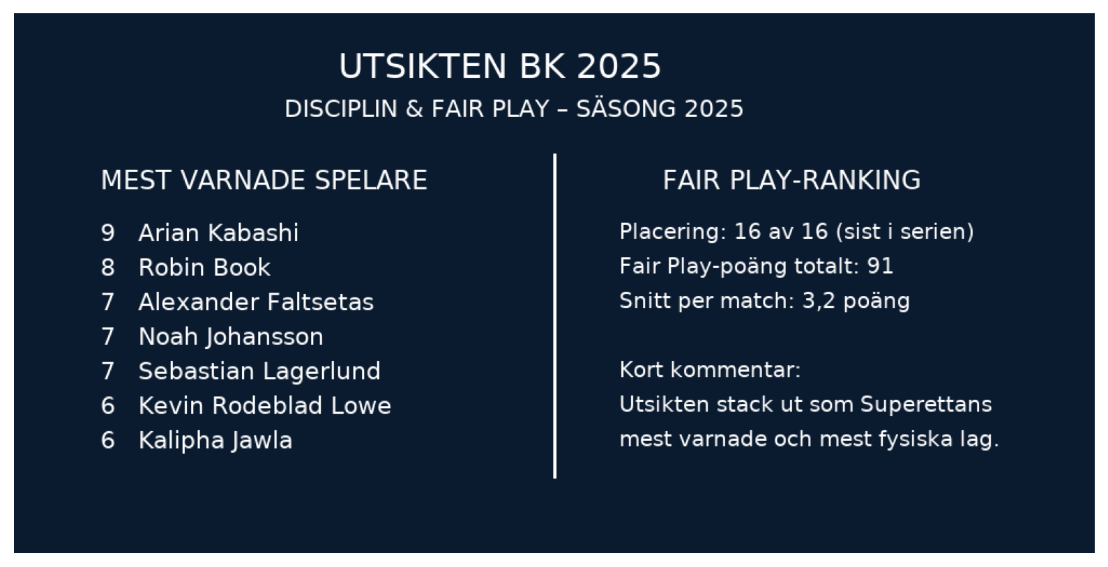 På disciplinsidan är Utsikten hela Superettans mest varnade lag: totalt 78 gula kort och dessutom 3 röda. Det blir ständiga avstängningar, mycket försvarsspel i numerärt underläge och fler fasta lägen emot när man drar på sig frisparkar runt eget straffområde. Det hänger ihop med att man redan släpper in 12 mål på fasta – en dålig kombination.