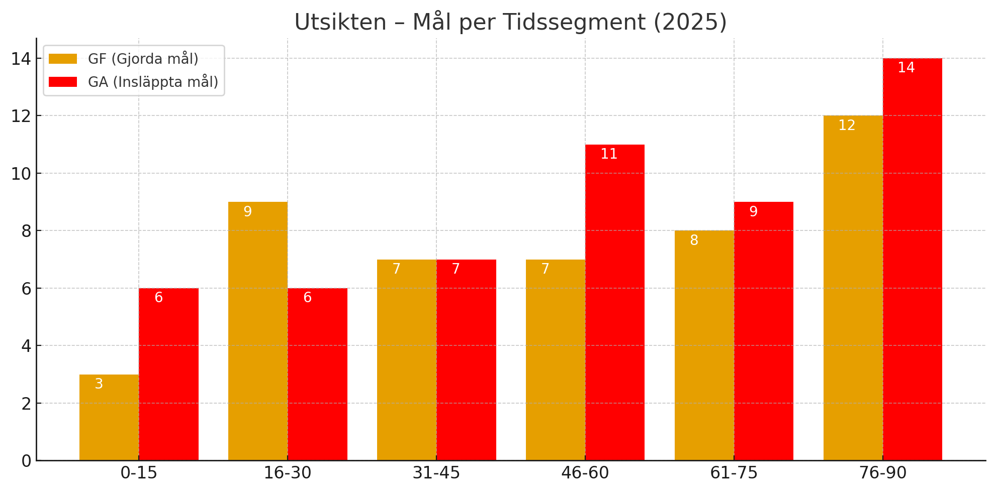 Utsikten gör flest mål i slutet (76–90), men släpper också in flest då.