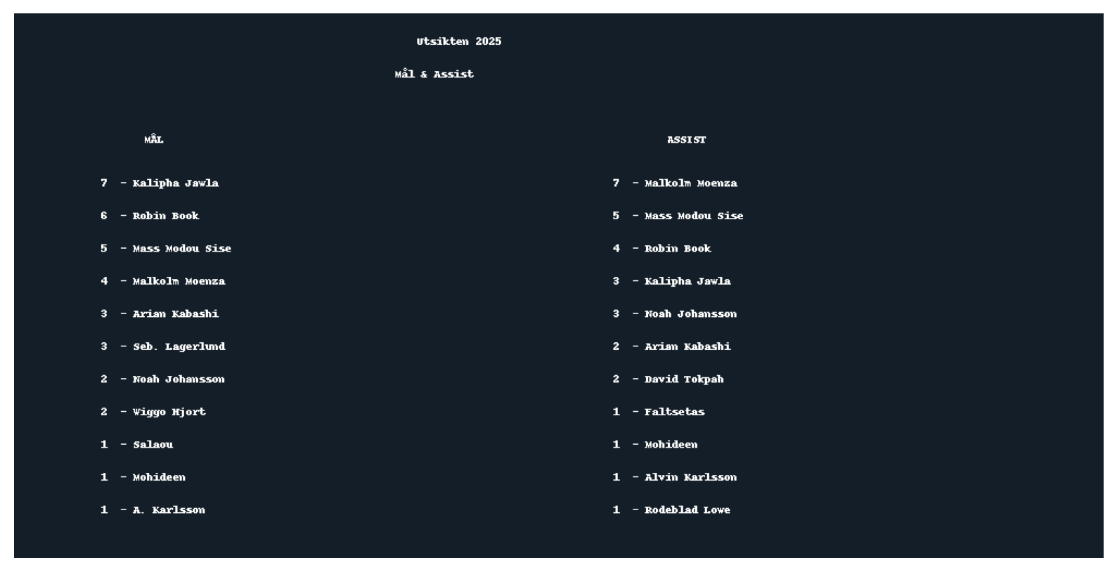 Samtidigt har man problem åt andra hållet. Motståndarna gör 12 mål på fasta mot Utsikten under säsongen. Med ett redan svajigt försvar gör det extra ont att släppa in så många på just frisparkar, hörnor och fasta lägen – moment där organisation, fokus och disciplin ska väga upp individuell kvalitet.