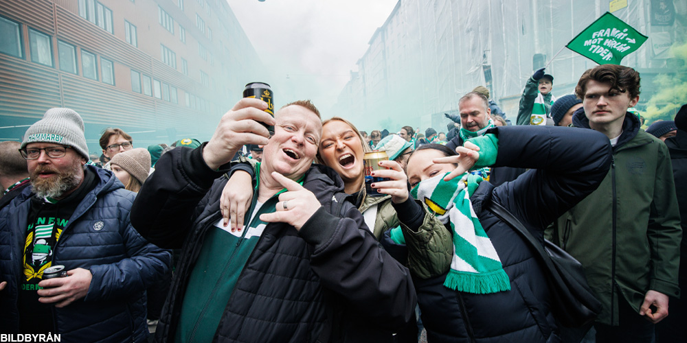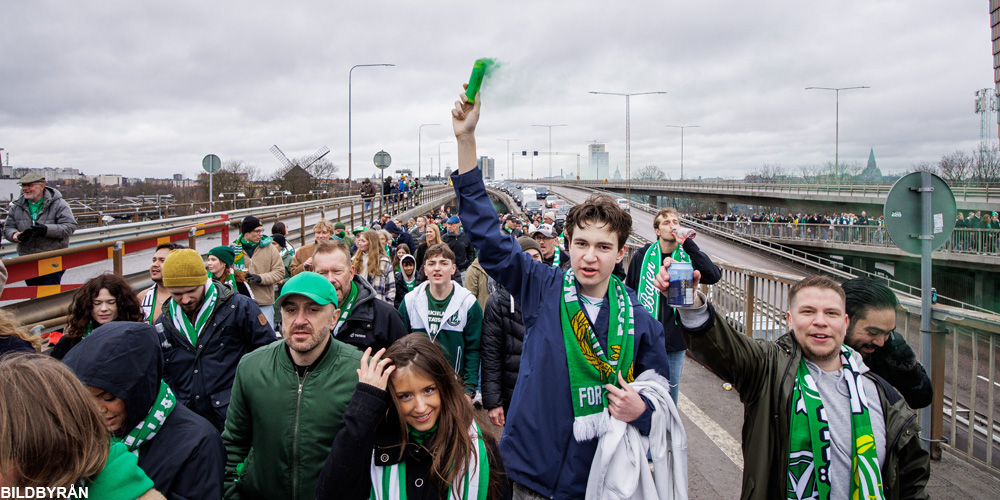 Traditionsenligt marscherar Hammarbys supportrar till hemmapremiären. Se när tusentals supportrar intar Södermalms gator. Och högklassiga tifon från båda lagen.