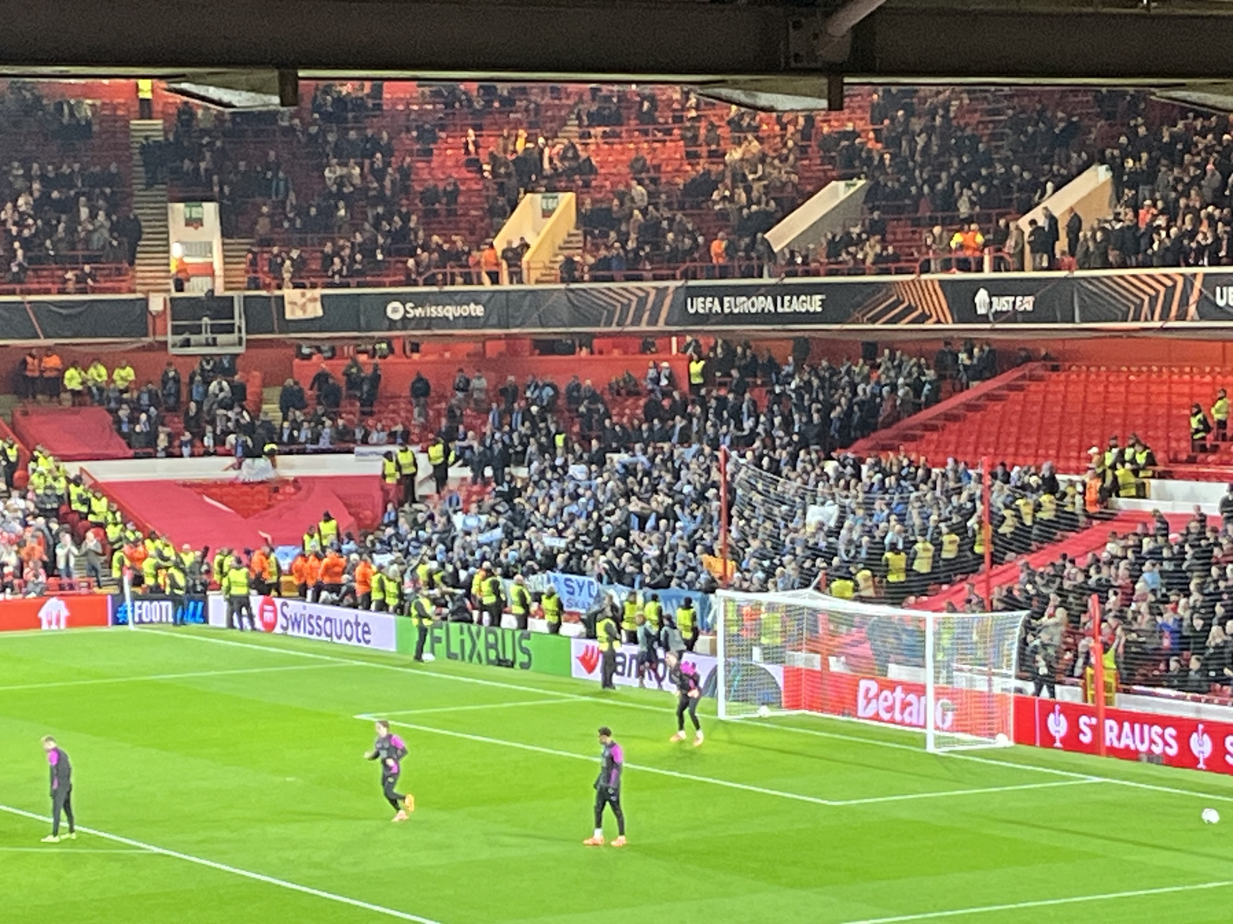 När jag var på uppsamlingspuben några timmar före avspark var det redan ett bra drag. Ramsorna skanderades efter varandra och supportrar jag pratade med lovade att sjunga sig hesa på bortasektionen under matchen. Mer intryck från uppsamlingspuben kan du läsa i min text här: https://www.svenskafans.com/fotboll/camp-sherwoodskogen-stamningen-fran-uppsamlingspuben-688407 . Annars förtjänar bortaföljet stora beröm för att i långa perioder överröstat hemmapubliken med ramsor och bra gung. Medan Forestpubliken blev tysta och bekväma vid ledning så ökade Malmö-klacken bara mer och mer. Om de himmelsblå spelarna stod för en blek insats på plan kan man säga det motsatta om supportrarnas prestation. Är det något vi kan vara väldigt stolta över är det att MFF låter högst, även ute i Europa.