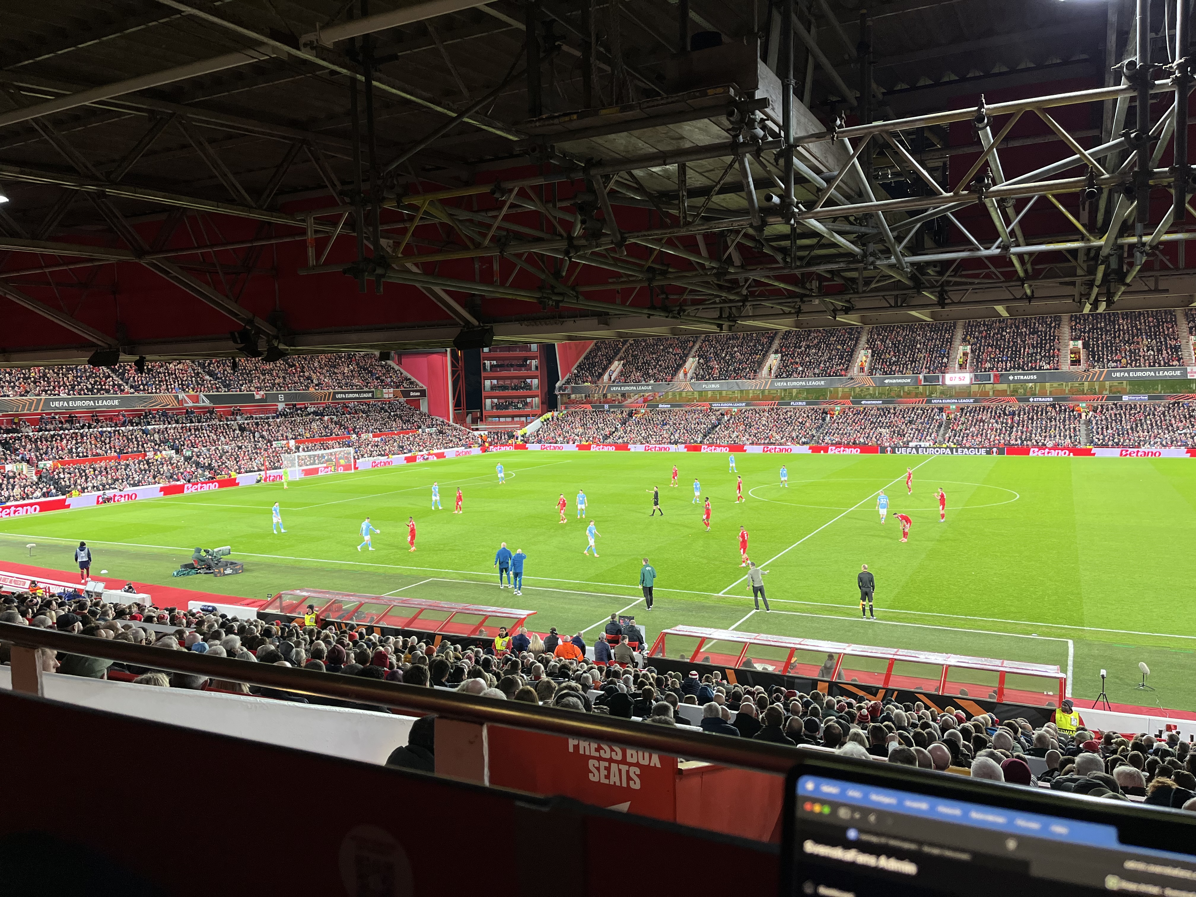 Vyn från pressläktaren. Extra plus att Forest till matchen valde att spela i röda shorts (spelar till vardags i vita) för att låta MFF spela i sitt hemmaställ med vita shorts likt Europacupfinalen 1979.