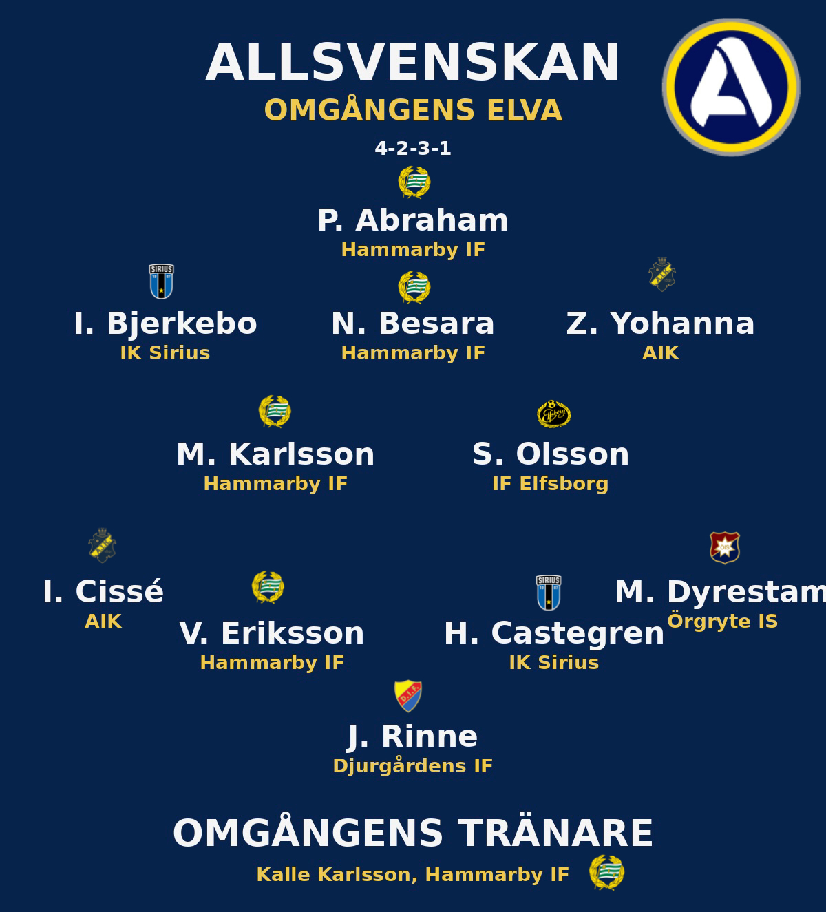Karlsson tar plats i omgångens elva efter en match där han gav Hammarby både energi, kontroll och mycket arbete i båda riktningarna i 3–0-segern mot Mjällby. Det här var inte en insats som byggde på mål eller assist, utan på att han hela tiden hjälpte Hammarby att få matchen dit laget ville.