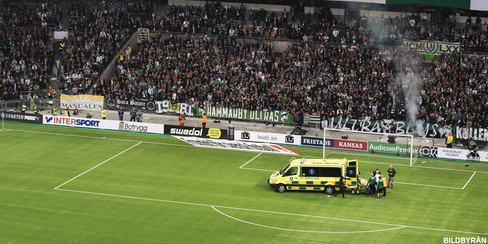 Matchvinnaren Erik Israelsson utkörd med ambulans Foto: Bildbyrån.