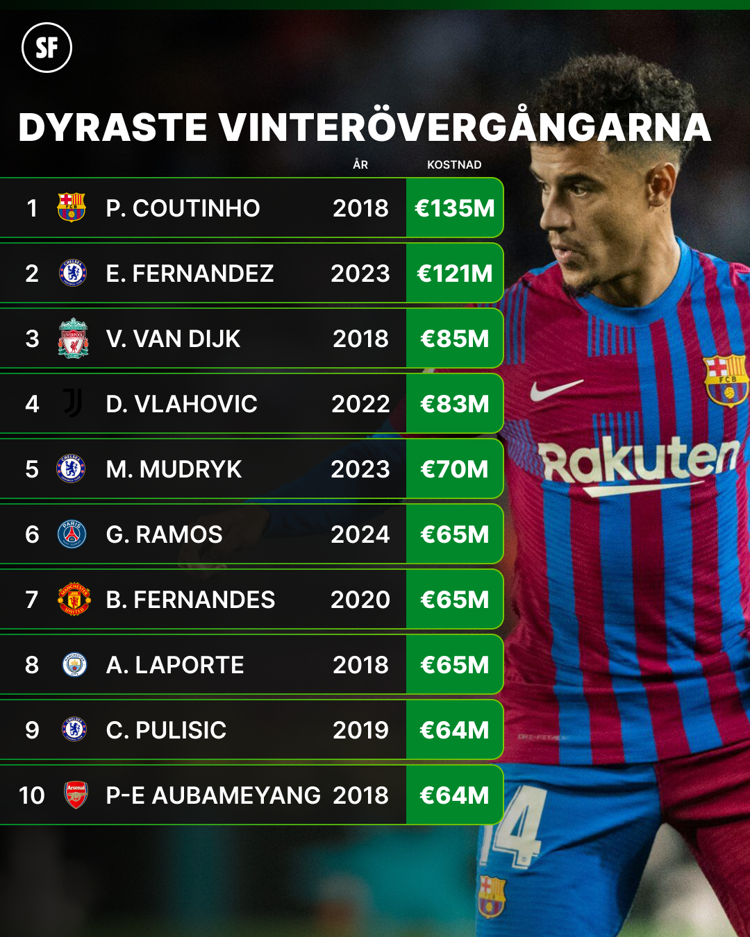 Den dyraste vinterövergången genom tiderna är fortfarande Philippe Coutinhos flytt från Liverpool till Barcelona i januari 2018. En affär som kom att symbolisera Barcelonas sportsliga och ekonomiska problem. Samtidigt visar listan att rätt januarivärvning kan förändra en klubb, något Virgil van Dijk och Bruno Fernandes är tydliga exempel på.