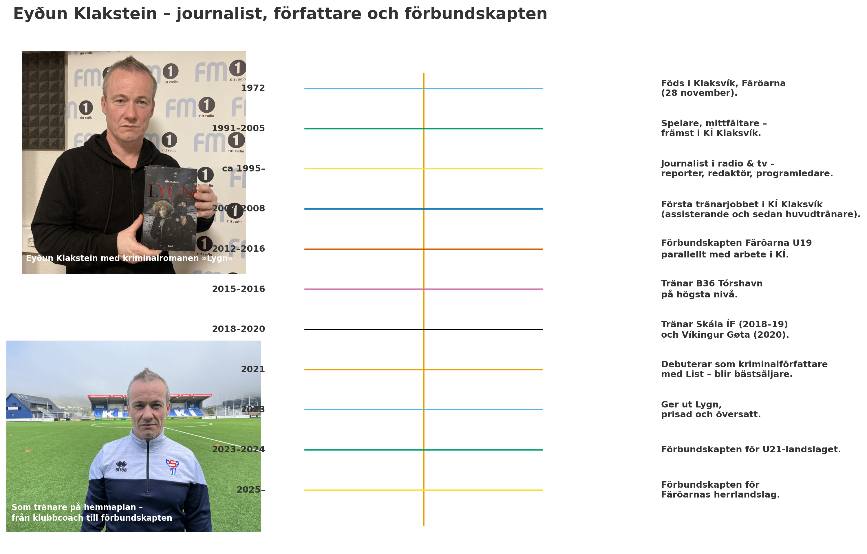 När Eyðun Klakstein tar över landslaget 2025 är det första gången på länge som herrlandslaget leds av en färöisk tränare. Han är inte bara fotbollstränare – han har bakgrund som journalist, har skrivit kriminalromaner, har tränat KÍ Klaksvík och är djupt rotad i den lokala fotbollskulturen.