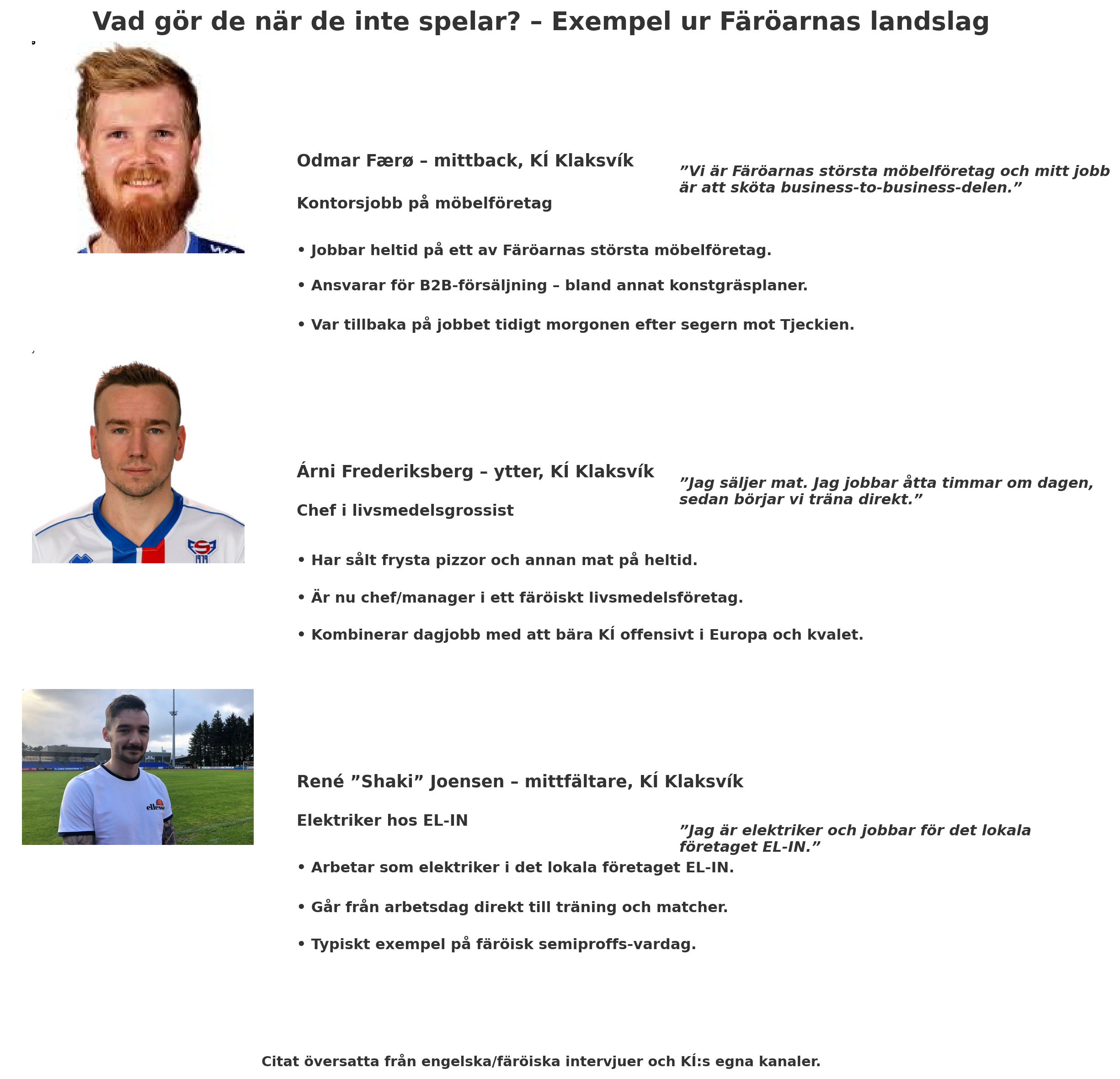 Det mest spridda exemplet är mittbacken Odmar Færø. Efter insatsen mot Tjeckien – där han av både utländsk media och förbundsledning lyftes som en av planens bästa – var han tillbaka på kontoret dagen efter på sitt jobb i ett möbelföretag.