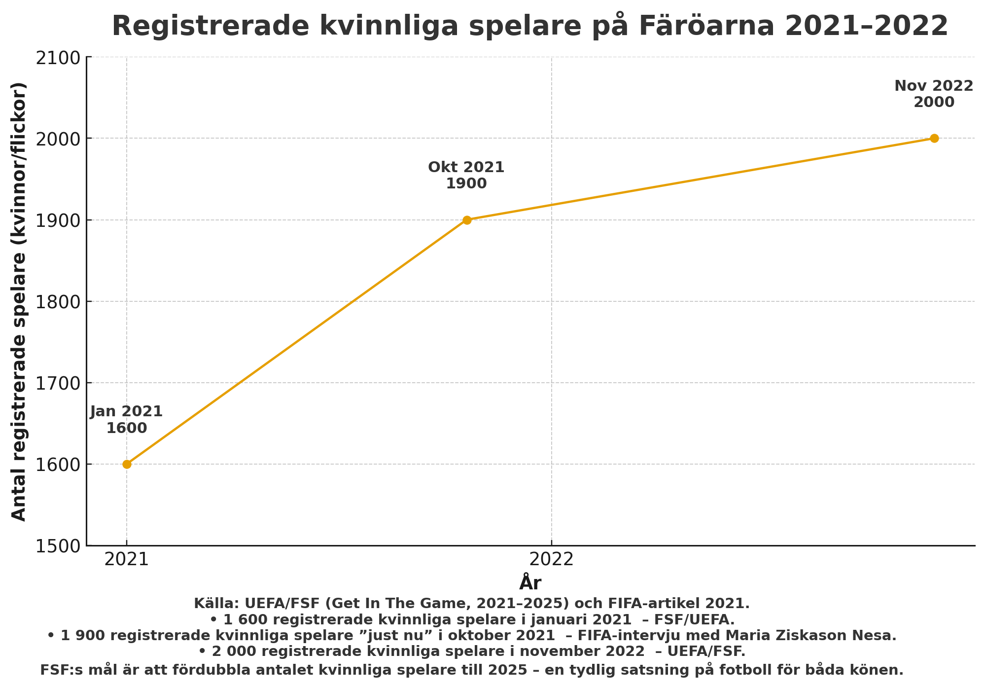 Kvinnofotbollen växer också snabbt. Mellan 2021 och slutet av 2022 ökade antalet registrerade kvinnliga spelare från cirka 1 600 till omkring 2 000, enligt UEFA. Det betyder fler fotbollsspelare totalt, fler som ser landslaget som en naturlig del av sin vardag, fler som dras in i kulturen.