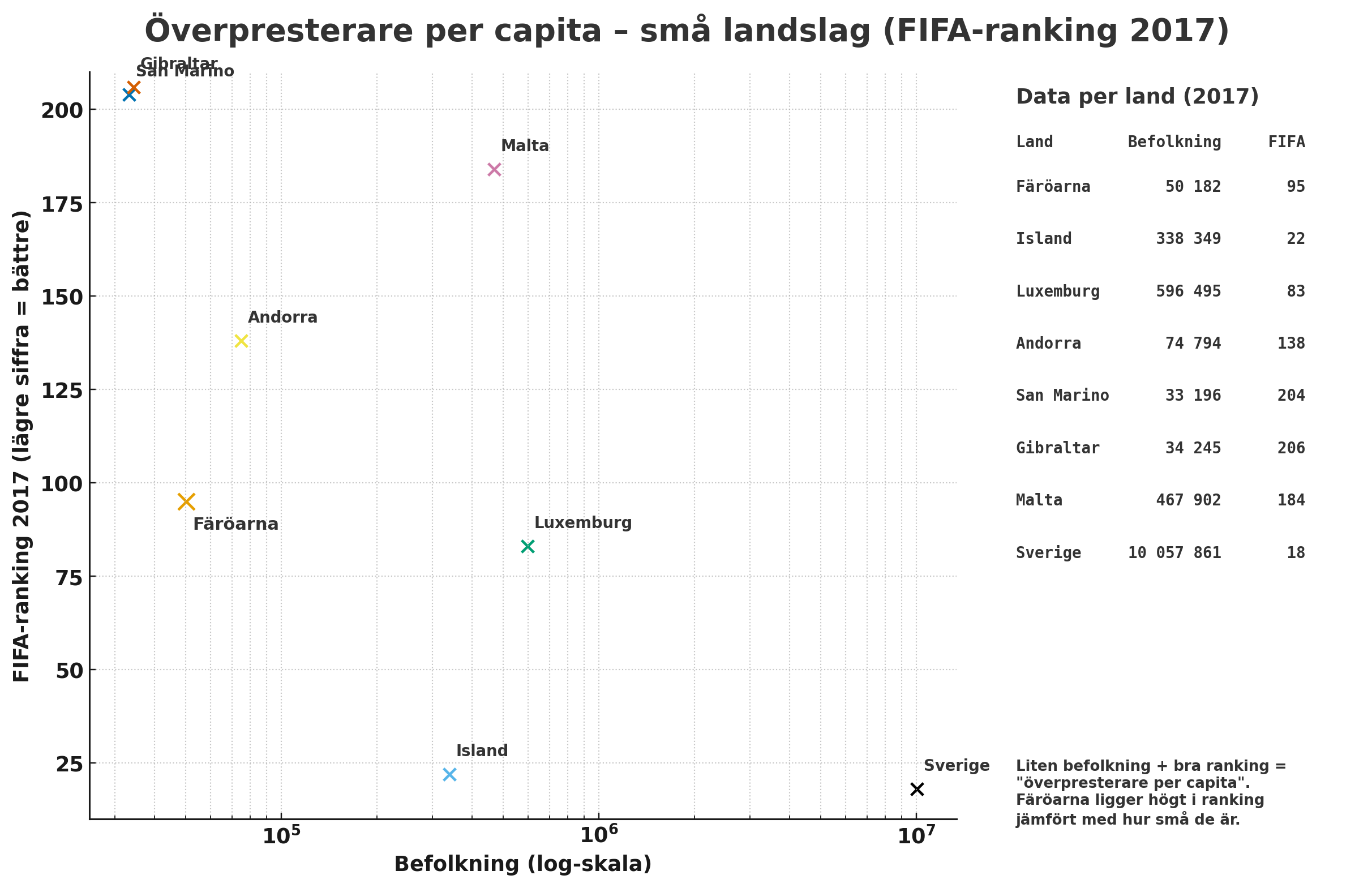 2017 kommer en mer abstrakt bekräftelse. En analys som jämför FIFA-ranking med befolkningsstorlek lyfter fram Färöarna som ett av världens mer överpresterande landslag, mätt i rankingpoäng per capita. Med så få invånare, men relativt stabila resultat, sticker de ut i statistiken.