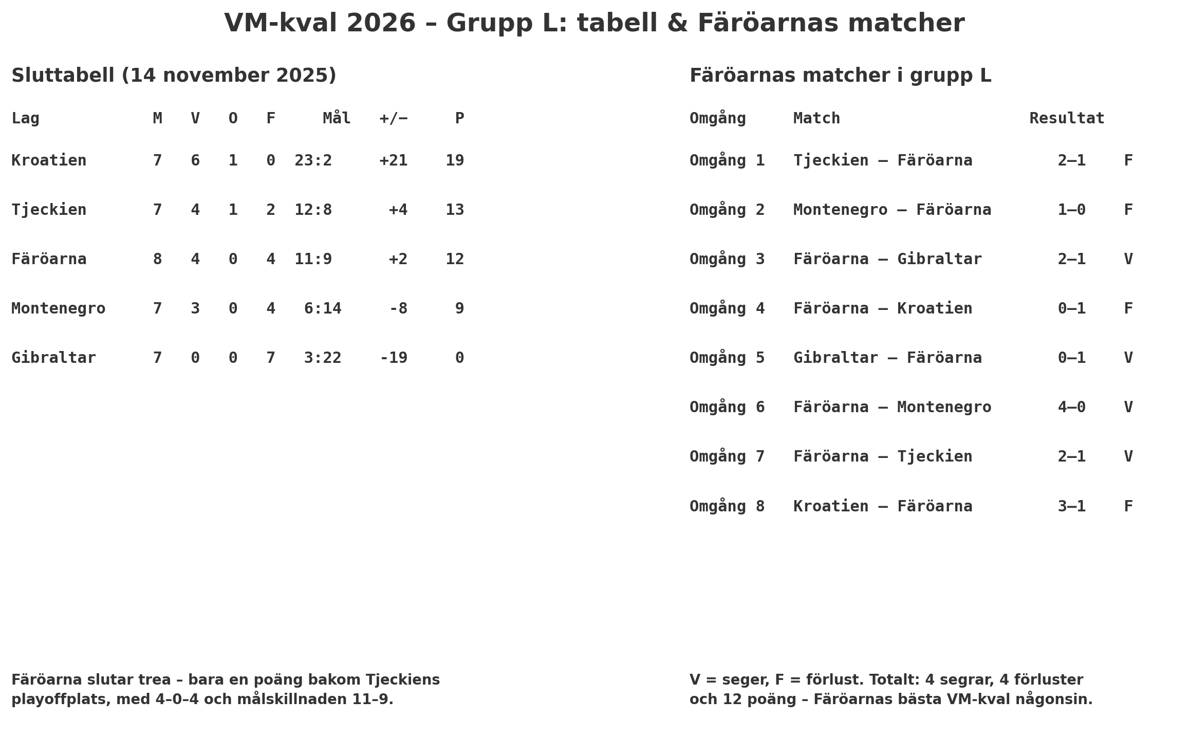 De når dock inte hela vägen. Kroatien säkrar gruppsegern hemma, Tjeckien snubblar förmodligen inte mot Gibraltar, och Färöarna slutar trea. Men när man tittar på raden – fyra segrar, fyra förluster, målskillnad 11–9 – är det ändå deras bästa kval någonsin, med marginal.