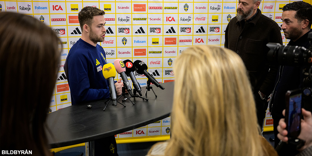 När Sverige spelar den avgörande playoff-finalen hemma mot Polen väntas Gabriel Gudmundsson springa längs den blågula vänsterkanten. Under måndagen tog han emot frågor från de svenska medierna i den mixade zonen – bland annat om sin imponerande insats mot Ukraina i semifinalen.