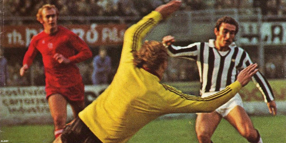 Piet Schrijvers kastar sig framför Juventus Oscar Damiani i UEFA-cuepn 1974/75. Till vänster Horst Blankenburg.