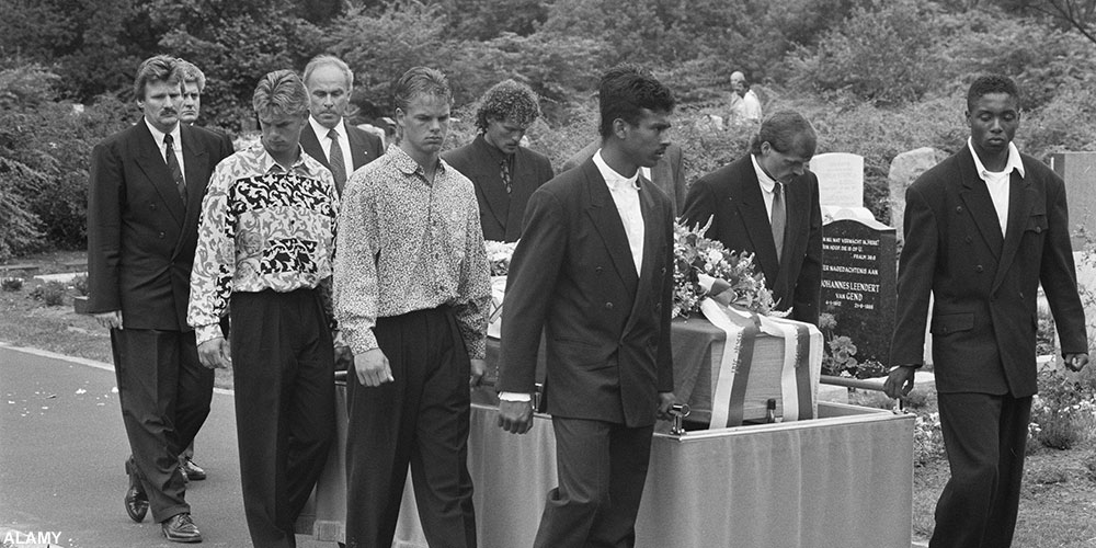 Lloyd Doesburgs begravning. Kistbärare närmast kameran, fr. v.: Ronald de Boer, Frank de Boer, Aron Winter. Kistbärare bortre sidan fr. v.: Danny Blind, Jan Wouters, Bryan Roy. Bakom kistan fr. v.: Arie van Van Os och Michael van Praag. Bakom van Os skymts Peter Larsson.