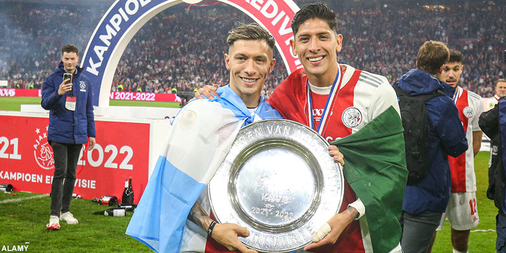 Lisandro Martinez och Edson Álvarez med titelskölden.