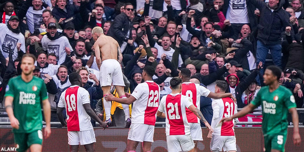 20 mars spelas en het De Klassieker. Väldigt het. Den inleds nämligen med att pyroteknik sätter eld på delar av F-Sides tifo inför avspark så spelet måste skjutas upp ett tag medan branden släcks. Sen blåses matchen igång och det blir en riktig holmgång. Arne Slots Feyenoord pressar högt och tar snart ledningen genom Luis Sinisterra. Men Haller kvitterar för Ajax. Feyenoord återtar dock ledningen efter att Berghuis, till Feyenoord-supportrars stora skadeglädje, stått för ett kostsamt bolltapp. I andra halvlek kvitterade Tadic genom att skruva in en frispark i krysset. Sen passade han fram Tagliafico som spelade in till Antony som sköt in 3-2 och fick eldhärjade läktarna att brisera i jubel. Matchen får ett kaosartat slut. Först försöker Feyenoords Bryan Linssen filma till sig en straff, sen börjar Davy Klaassen och Lutshaarel Geertruida nästan slåss. Sen får Antony en smäll och ligger kvar utanför sidlinjen. När domare Danny Makkelie inte blåser hoppar han in på planen igen och haltar omkring tills Tadic knuffar omkull honom så att han ligger ner igen. Feyenoord tappar fokus helt, Makkelie ger Antony sitt andra gula kort och han blir utvisad men vad gör det. Snyggt var det inte, men vinner matchen, det gör Ajax.