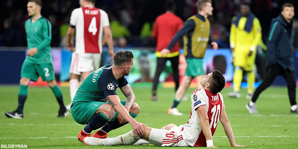 Ajax får en kanonstart då Matthijs de Ligt nickar in 1-0 på en hörna från Hakim Ziyech efter fem minuter. Efter en halvtimme curlar Ziyech själv in 2-0. Ajax går på rosor, 3-0 totalt och ena foten i Champions League-final. Men så sker det, det värsta haveriet i klubbens historia. Mauricio Pochettino byter in Fernando Llorente till andra halvlek och Tottenham börjar slå långt. Av någon anledning är det kryptonit för Ajax. Llorente suger ner alla bollar. Mittfältskampen börjar kantra över åt fel håll, plötsligt ser Lasse Schöne lite för trög ut. En snabb dubbel från Lucas Moura tio minuter in i halvleken sätter panik i Ajax. Man leder fortfarande med 3-2 totalt men något måste göras känner ten Hag. Schöne ut och Veltman in, Mazraoui till mittfältet. Några minuter senare Dolberg ut och Sinkgraven in. Det andra bytet känns obegripligt med tanke på att Huntelaar finns på bänken – någon som kan stångas där uppe och vara en target att få upp bollen på.