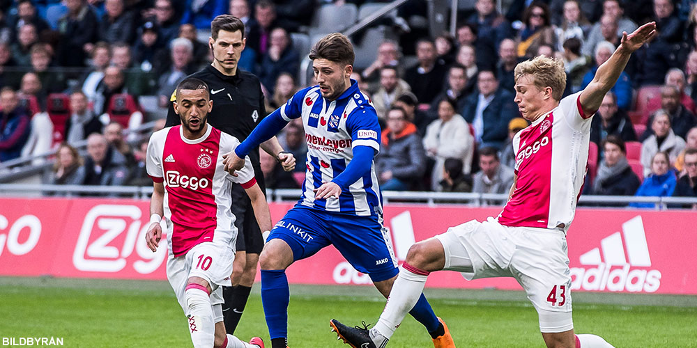 Hakim Ziyech och Rasmus Kristensen i närkamp med Arber Zeneli i Heerenveen i februari 2018.