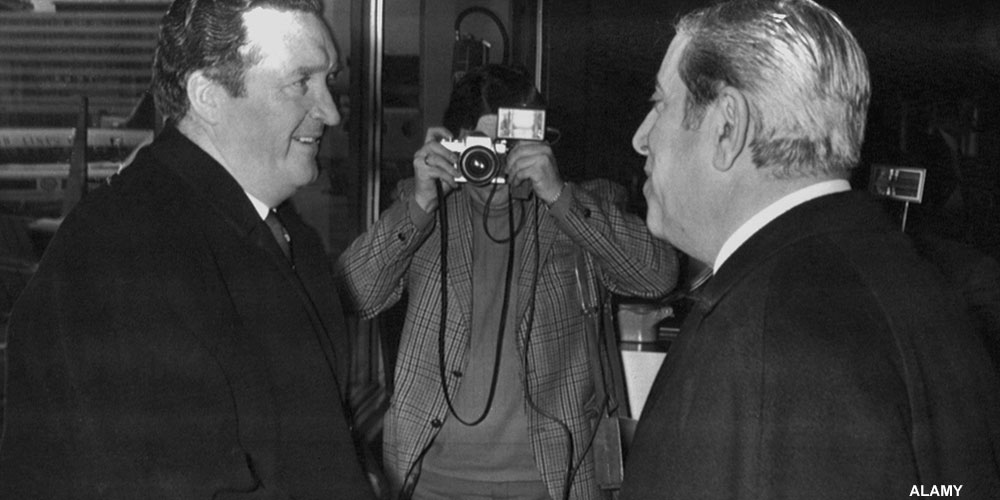 Ajax ordförande Jaap van Praag (till höger) hälsar Celtics legendariske manager Jock Stein välkommen till Amsterdam.