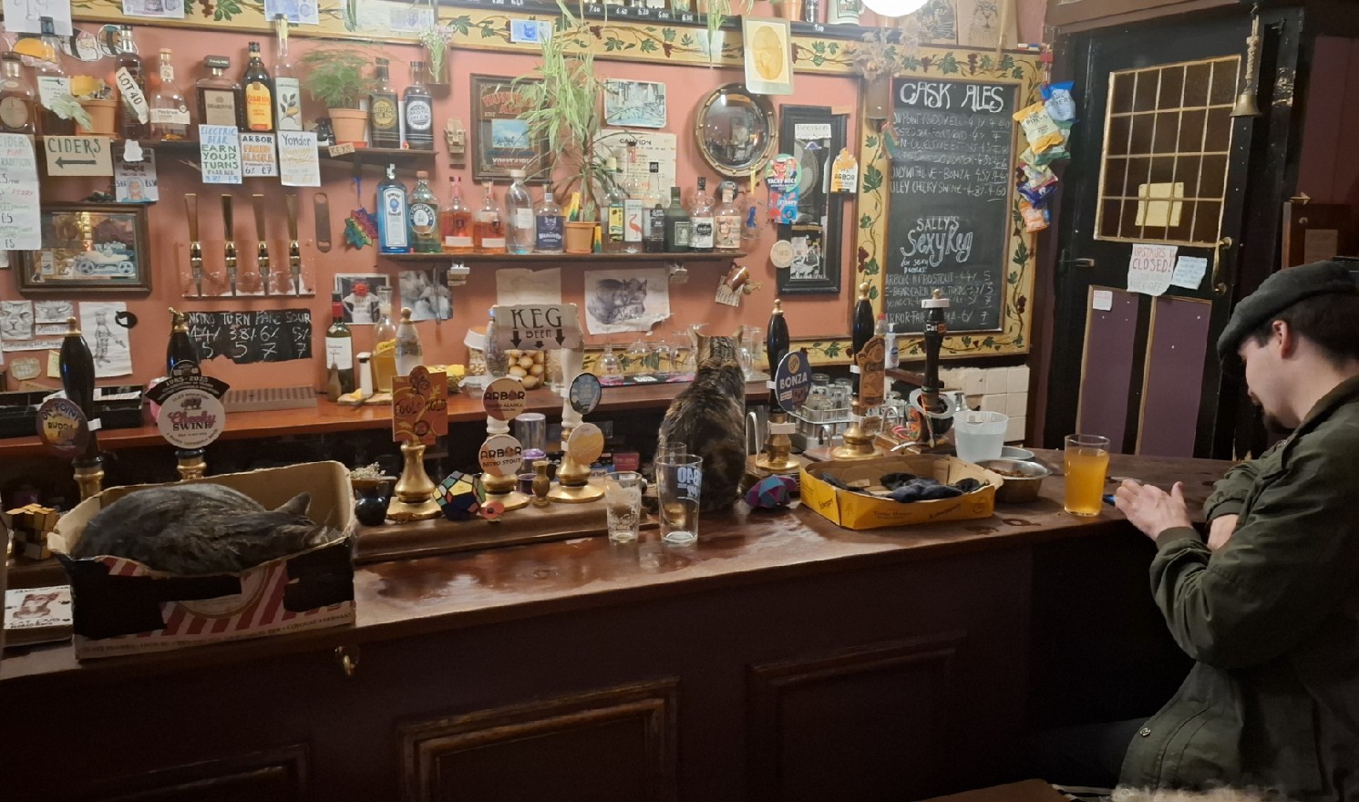 Efter årsmötet splittrades vi upp och några begav oss mot stadens mer centrala delar för att fortsätta kvällen. Bland annat besökte vi en pub där katter sov/strövade fritt på bardisken.