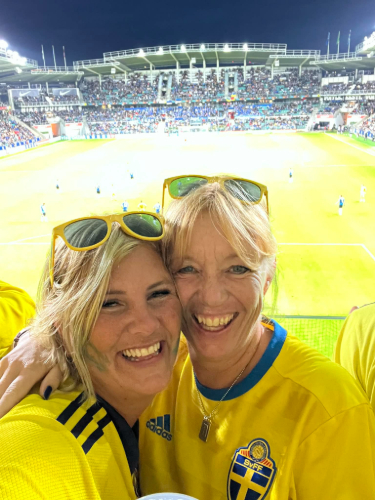 Där stod vi, jag och min vän Catrine, iklädda blågult, med ett leende som sa “det här kan bara bli bra”. Och det blev det. Inte nödvändigtvis på planen – men överallt annars.
