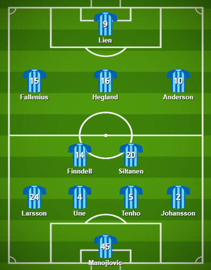 De två kvarvarande platserna i offensiven bör gå till Oskar Fallenius och Kristian Lien. Fallenius har precis som i förra årets cupspel startat säsongen riktigt fint och ser ut att ha fått nytt självförtroende efter den kraschade övergången till Schalke 04 som verkar ha gett mer än det tog. Lien fick äntligen göra mål i den tredje och avslutande gruppspelsmatchen efter flera försök i de tidigare två och det kan visa sig otroligt viktigt nu när vinna eller försvinna gäller och motståndet är tuffare.