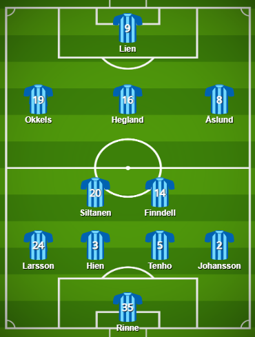I och med att Oskar Fallenius byttes ut skadad i matchen mot Malmö men har under veckan delvis varit tillbaka i träning. Eftersom Jeppe Okkels finns tillgänglig är det rimligt att han startar ute till vänster i offensiven så att Fallenius får vila den här matchen eller eventuellt göra ett kortare inhopp vid behov. Kristian Lien är självskriven som anfallare och till höger kommer antagligen Patric Åslund få förtroendet igen. Joel Asoro har gjort en del pigga aktioner när han har hoppat in och skulle kunna få sin första start men det är mer sannolikt att han återigen byts in under matchen.
