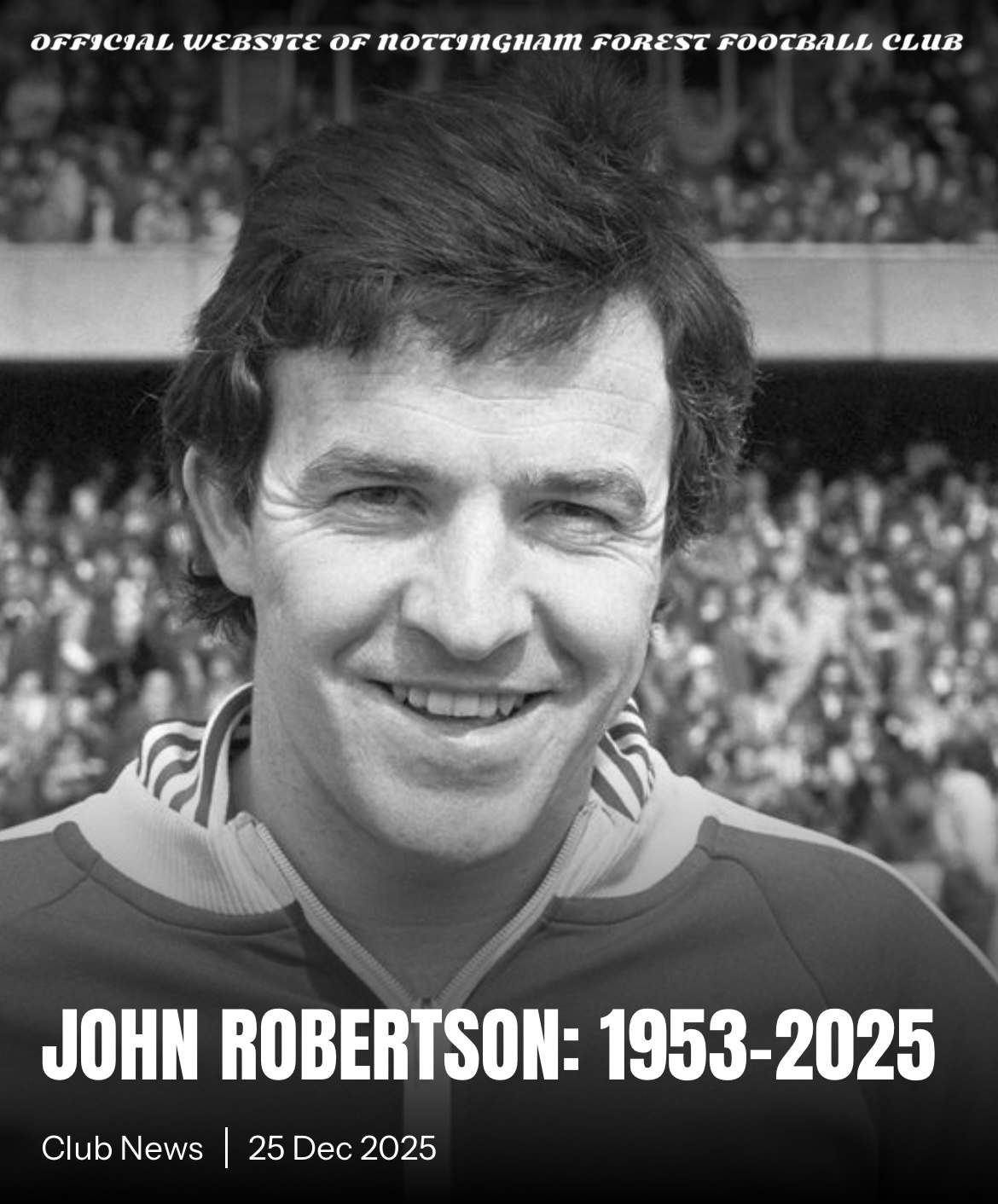 John Robertson somnade in på Juldagen vid en ålder av 72 år. https://www.svenskafans.com/fotboll/nottingham-forest-och-skottlands-tidigare-vansterytter-john-robertson-har-gatt-bort-under-juldagen-efter-en-langre-tids-sjukdom-han-blev-72-ar-gammal-689435