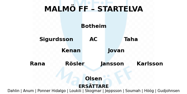 Malmö startade med en elva som signalerar “vi vill kunna ha bollen”: Olsen, Karlsson–Rösler–Jansson–Rana, Kenan–Jovan, AC centralt med Sigurdsson och Taha runt och Botheim längst fram.