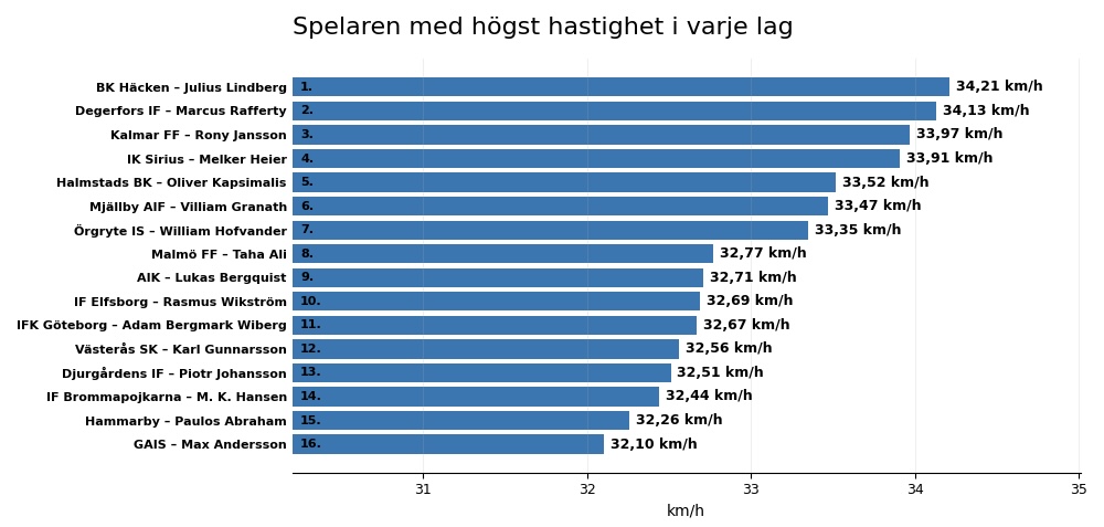 Även här är det viktigt att komma ihåg vad grafen visar: det här är spelarna som var snabbast i sina egna lag. Julius Lindberg var alltså inte bara snabbast i Häcken. Han var snabbast av alla lagens snabbaste spelare.