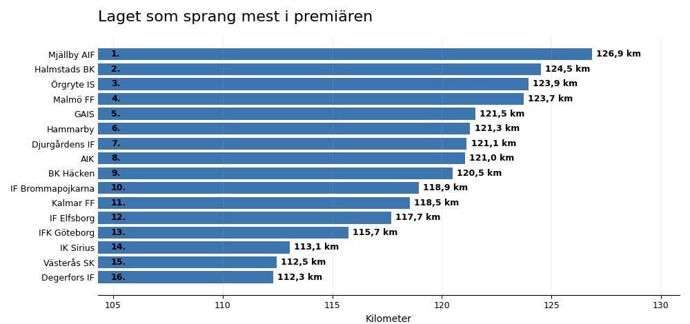 Tittar man på lagens totala löpsträcka är det Mjällby som toppar. De sprang 126,9 kilometer i sin premiär. Längst ner finns Degerfors på 112,3 kilometer.