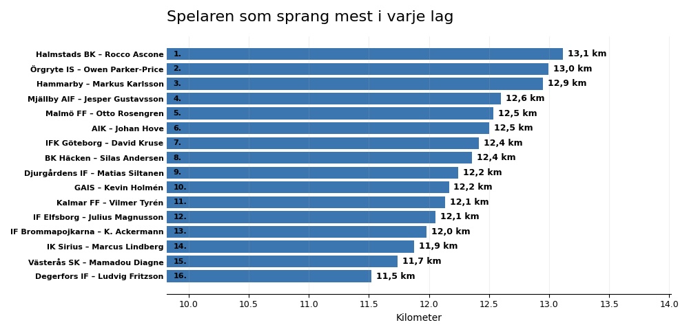 Den andra grafen handlar om spelarna som sprang mest i sina lag. Alltså inte vilka som sprang mest totalt i serien, utan vilka som var etta i sitt eget lag.
