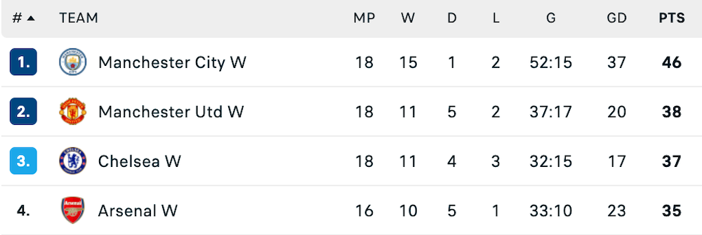 Toppen av WSL-tabellen, 24 mars 2026.