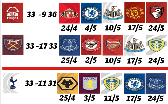 De röda är fortfarande delaktiga i kampen om nytt kontrakt, när det nu återstår fem omgångar av Premier League. Det är femton oerhört viktga poäng att spela om, och Spurs ligger risigast till. Laget från norra London har ingen seger i Premiere Leauge under 2026, då den senaste kom den 28:de december mot Crystal Palace. Att Burnley tillsammans Wolves lämnar ligan är klart, och det är tre lag som försöker undvika att hamna under nedflyttningsstrecket.
