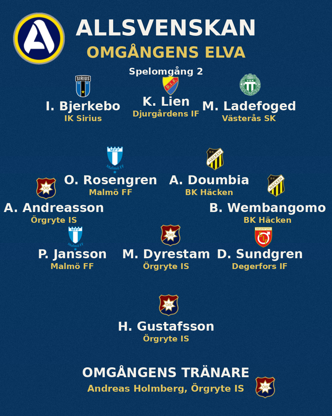 Isak Bjerkebo, IK Sirius Isak tar plats här för att han satte tonen direkt i en match där Sirius på förhand var tänkta att få jaga mycket utan boll. Hammarby hade 70 procent av bollinnehavet och 685 passningar, men ändå var det Sirius som fick matchen dit de ville. Där blev Bjerkebo viktig tidigt. Först låg han bakom Soumahs jätteläge med ett bra inlägg, och minuten efter satte han själv 1–0. Där måste man också passa på att hylla Krusnell, för vilken passning han levererar till målet. Den bollen öppnar hela situationen och Bjerkebo gör sedan resten starkt när han tar vara på läget. Det gav Sirius exakt den start de behövde.