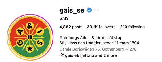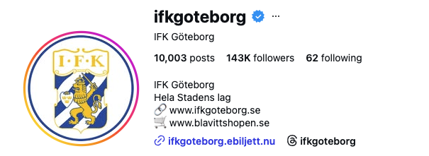 Motivering: Bion börjar bra med Hela stadens lag, som IFK trycker på i sin marknadsföring. Men att ha två oklickbara länkar i sin bio är inte godkänt. Och varför skriver man IFK Göteborg i sin bio också? Vi fattar vilka ni är. Ta med alla titlar istället kanske?