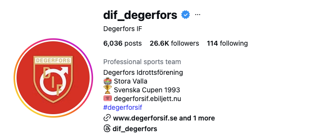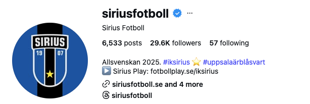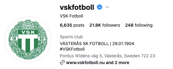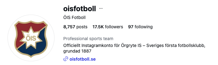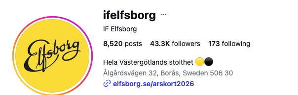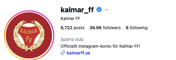 Motivering: Så många frågor här. Varför skryter man om att man var med i Allsvenskan förra året? Varför har man två hashtags? Varför en oklickbar länk? Spelet på planen har höjt sig senaste året, dock behöver man göra om hela insta-bion. Väldigt svag och rörig.