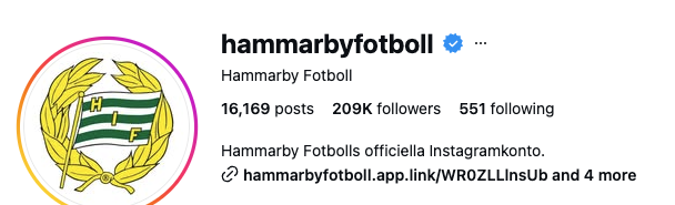 Motivering: Det är faktiskt inte okej att en så stor och anrik klubb som Hammarby har en så brutalt tråkig bio. Skryt om något, skriv något classy eller vad som helst. Att bara skriva att det är officiella kontot är inte godkänt. Svagt!